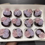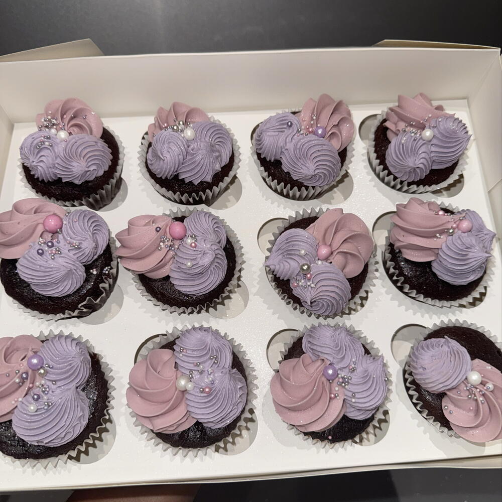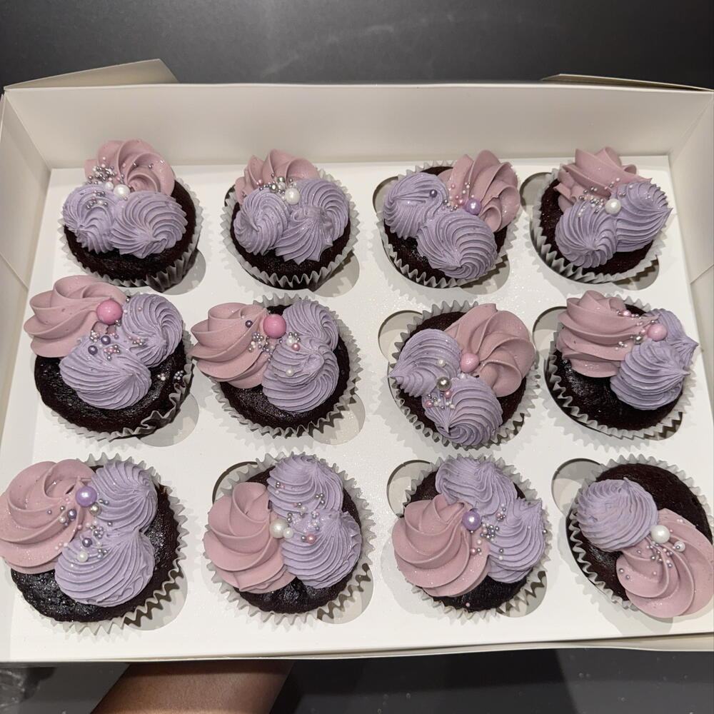12 in a box Vanilla Cupcakes, pink vanilla topped in edible glitter
