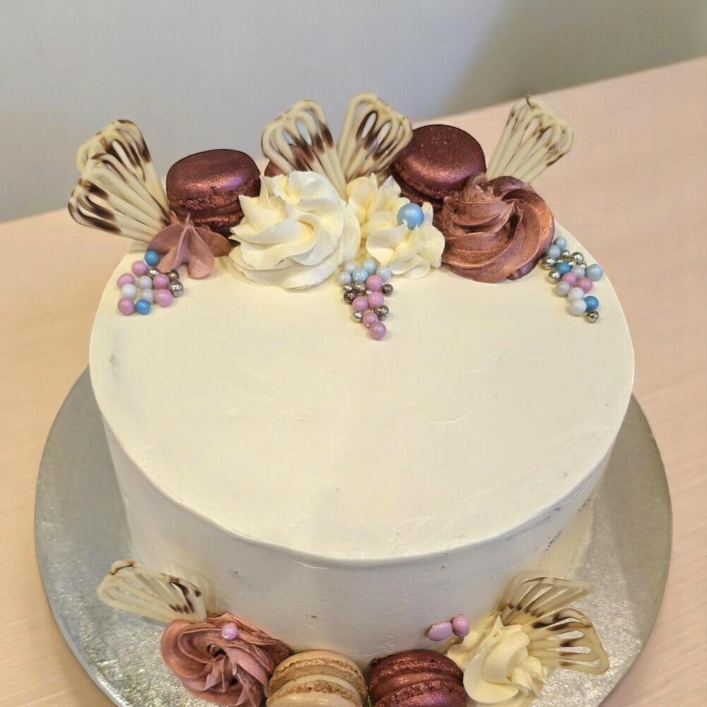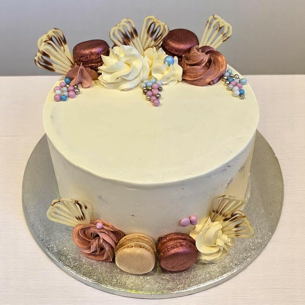 Elegant Celebration Cake with Macarons Cream Swirls | 8-Inch Custom Layers