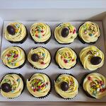 12 lemon flavoured cupcakes in a box.