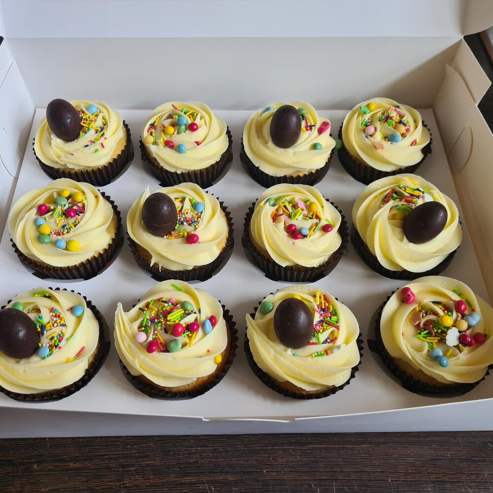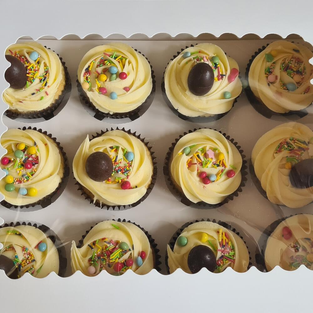 12 lemon flavoured cupcakes in a box.