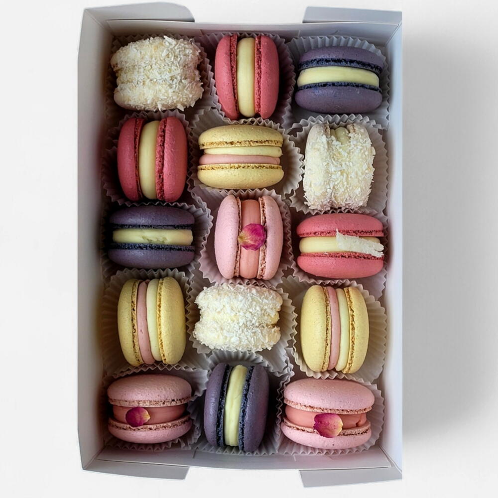 Assortments are made from FLAVOURS CURRENTLY IN STOCK. Please check availability when placing your order. LOW SUGAR Macarons are made of Extra Fine Almond flour, Belgian Chocolate, fresh cream and 100% natural fruit and berry puree. Macarons are lovingly packed in a gift box tied with a pink satin ribbon, accompanied by a Greeting card with warm wishes. The perfect gift for someone you love — or a sweet treat just for yourself. 5 flavors are available. Pick your favorites and create your own box.