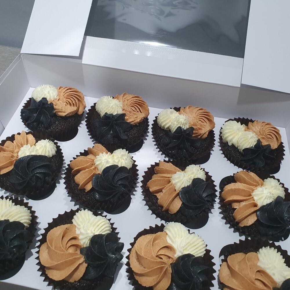 Bold, elegant, and irresistibly rich—this box of 12 cupcakes is a showstopper for any modern celebration. With dramatic swirls of black, caramel gold, and ivory cream frosting, each cupcake is a statement piece that pairs visual sophistication with decadent chocolatey goodness. Perfect for birthdays, corporate events, or a sleek dessert table, these cupcakes bring both style and flavor. The contrasting colors create a stunning visual balance that’s sure to turn heads and spark conversation. Each bite delivers a soft, moist base with smooth, buttery frosting. Presented in a clean white box, they’re ready to impress from the moment they arrive. A luxurious treat for those who love bold aesthetics with gourmet taste.