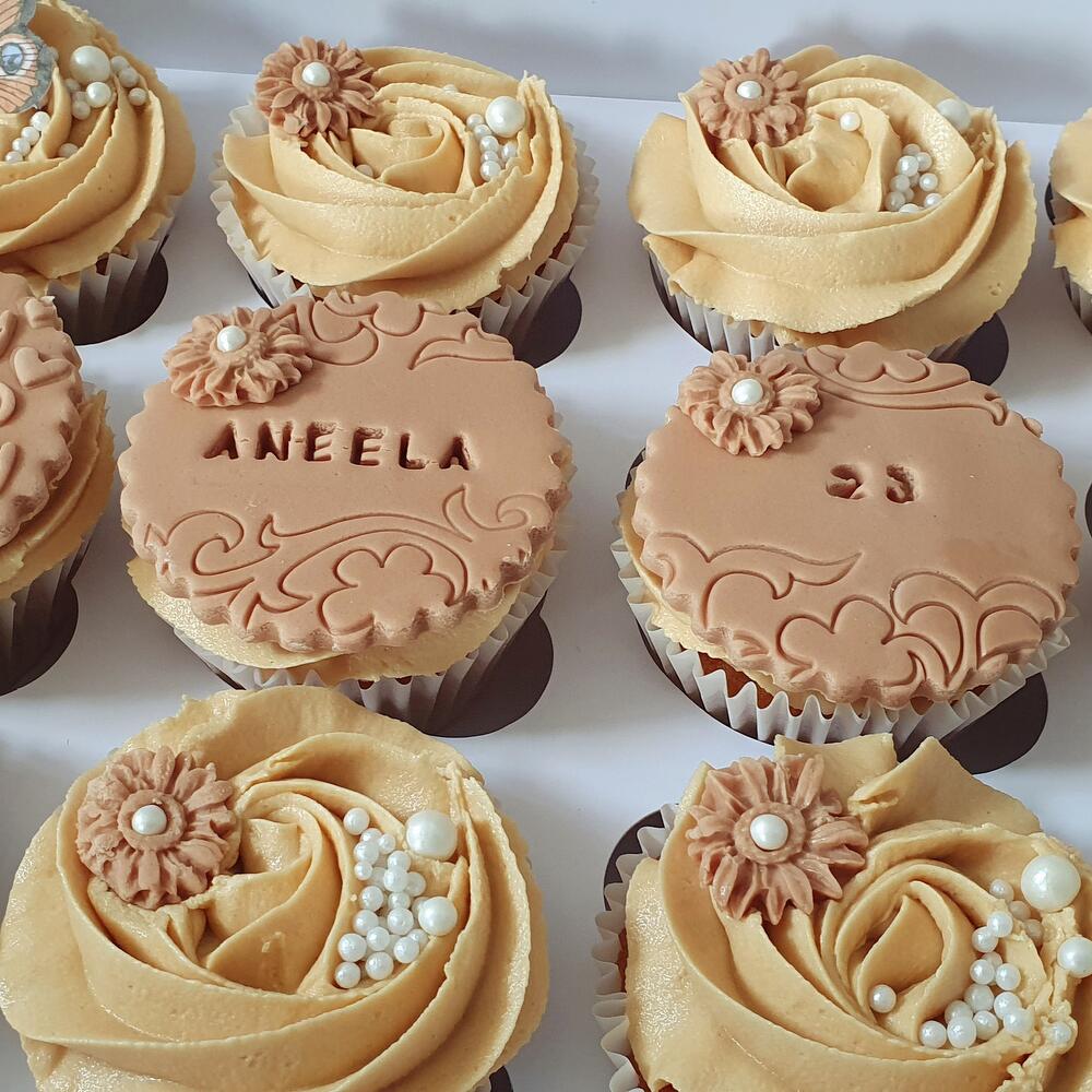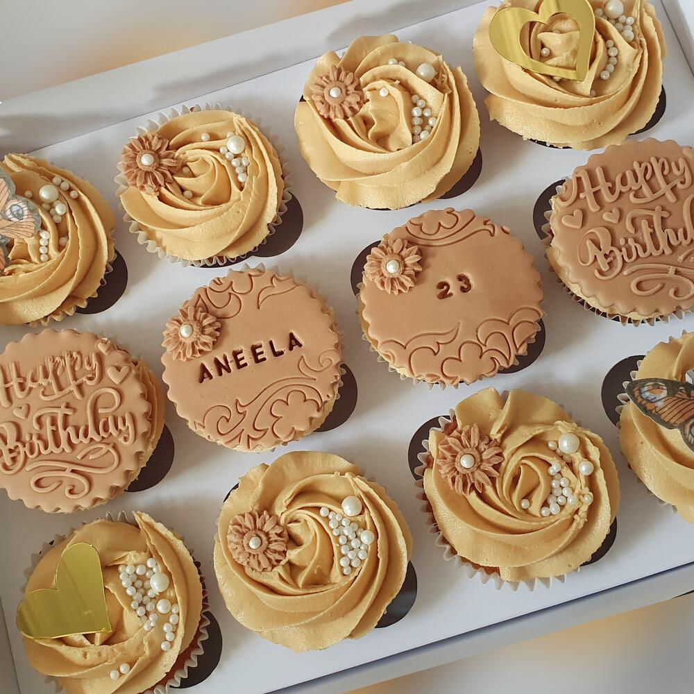 Celebrate in style with this chic and elegant cupcake set designed to impress! Featuring 12 beautifully crafted cupcakes in warm caramel and nude tones, each treat is adorned with delicate pearls, edible florals, butterflies, and golden hearts. Personalized with messages like Happy Birthday, the celebrants name and age, this set makes any birthday extra special and memorable. The smooth buttercream swirls and fondant details add a luxurious touch to every bite. Perfect for gifting or as the centerpiece of your celebration table. Whether youre honoring someone turning 23 or simply love classy aesthetics, these cupcakes are a delightful indulgence. A sweet fusion of beauty and flavor, ready to make any occasion golden!