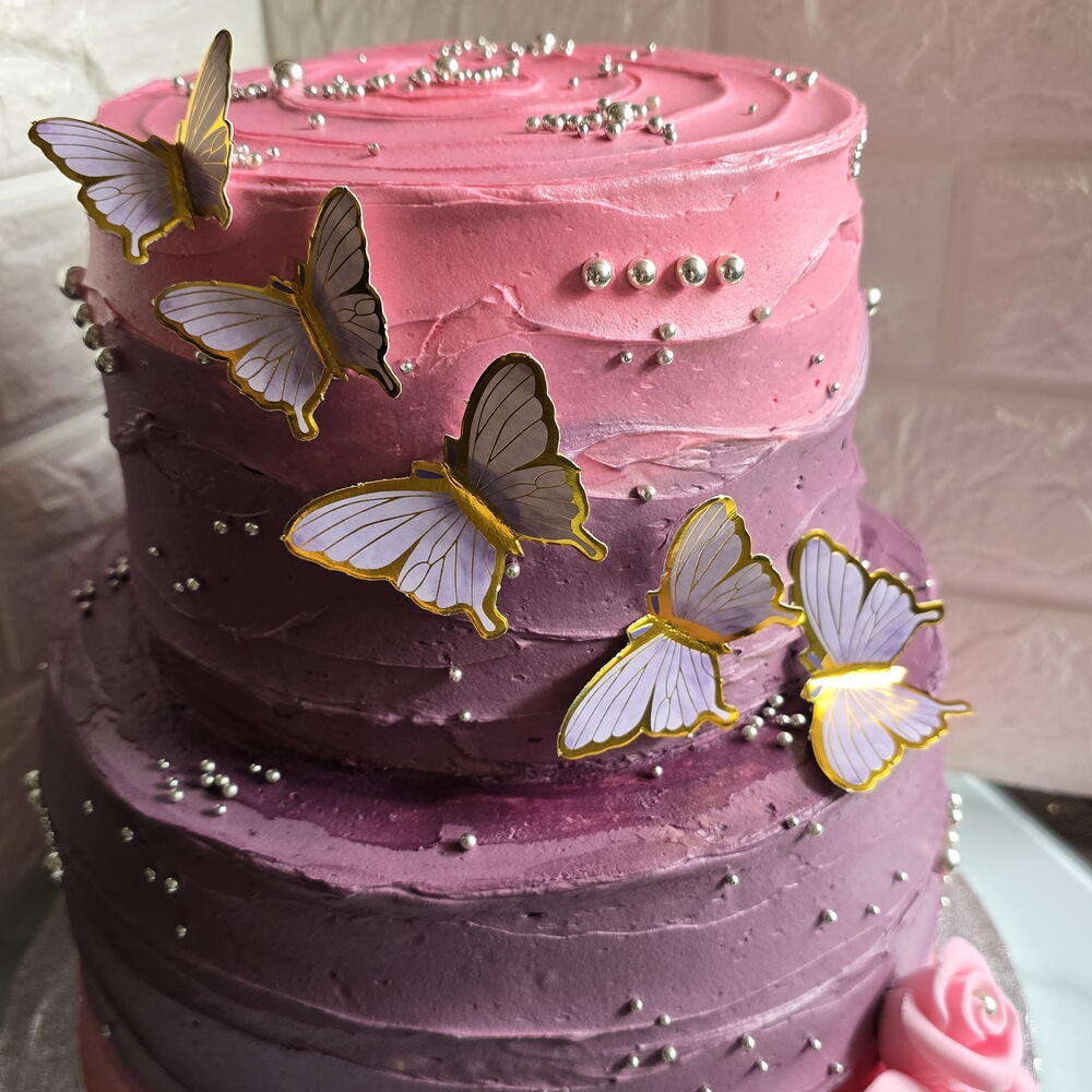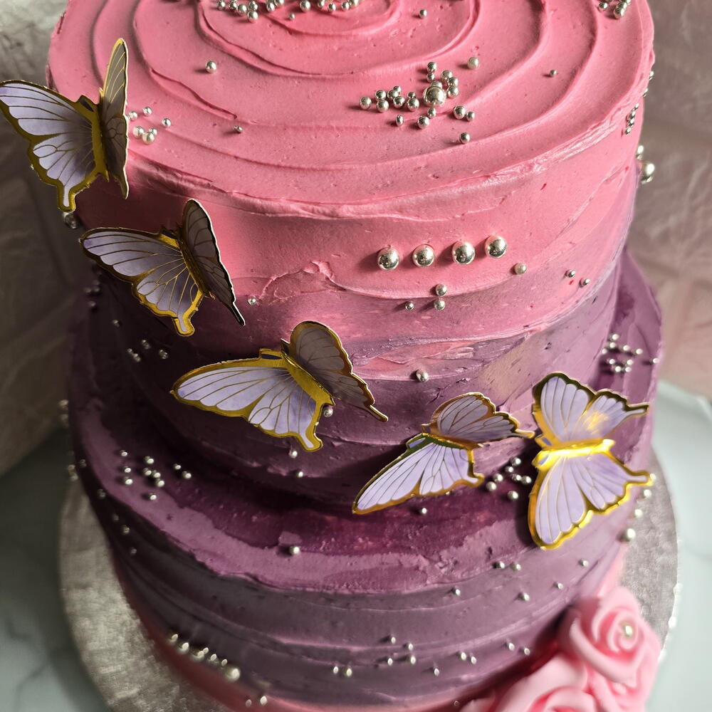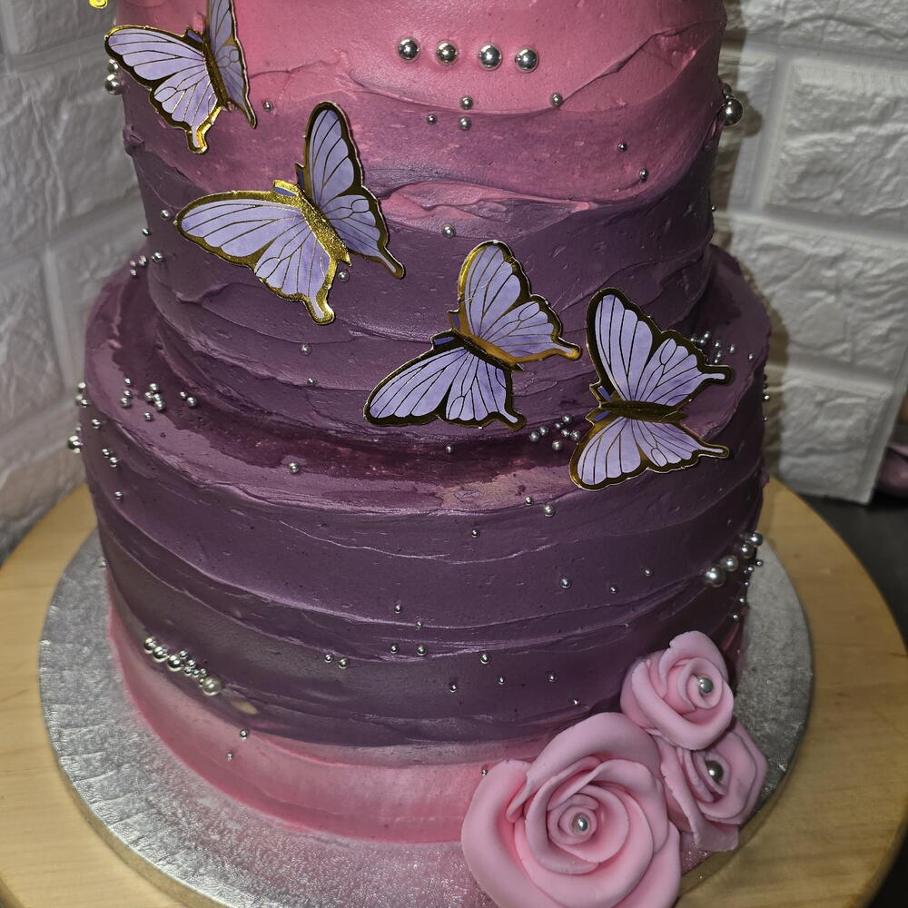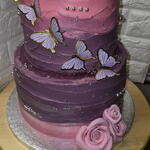 2 layers birthday cake. Covered with pink and purple butter cream and decorated with butterflies.