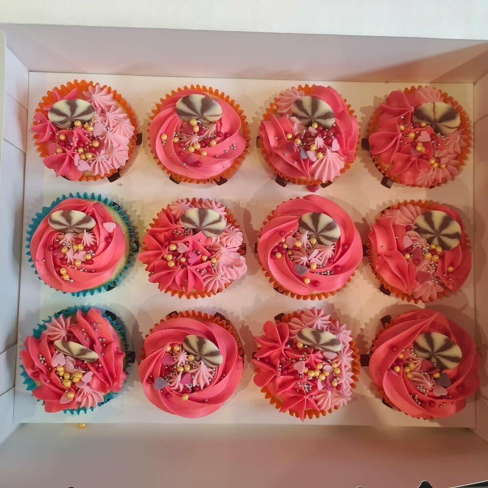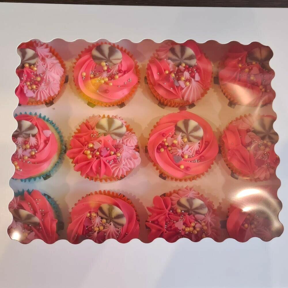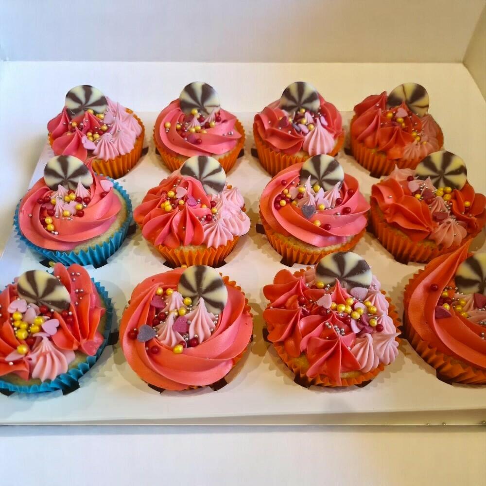 Vanilla flavoured Valentines Day cupcakes. Can be any flavour. 12 cupcakes in a box. Available flavours: chocolate, vanilla, lemon, strawberry, rum-raisen.