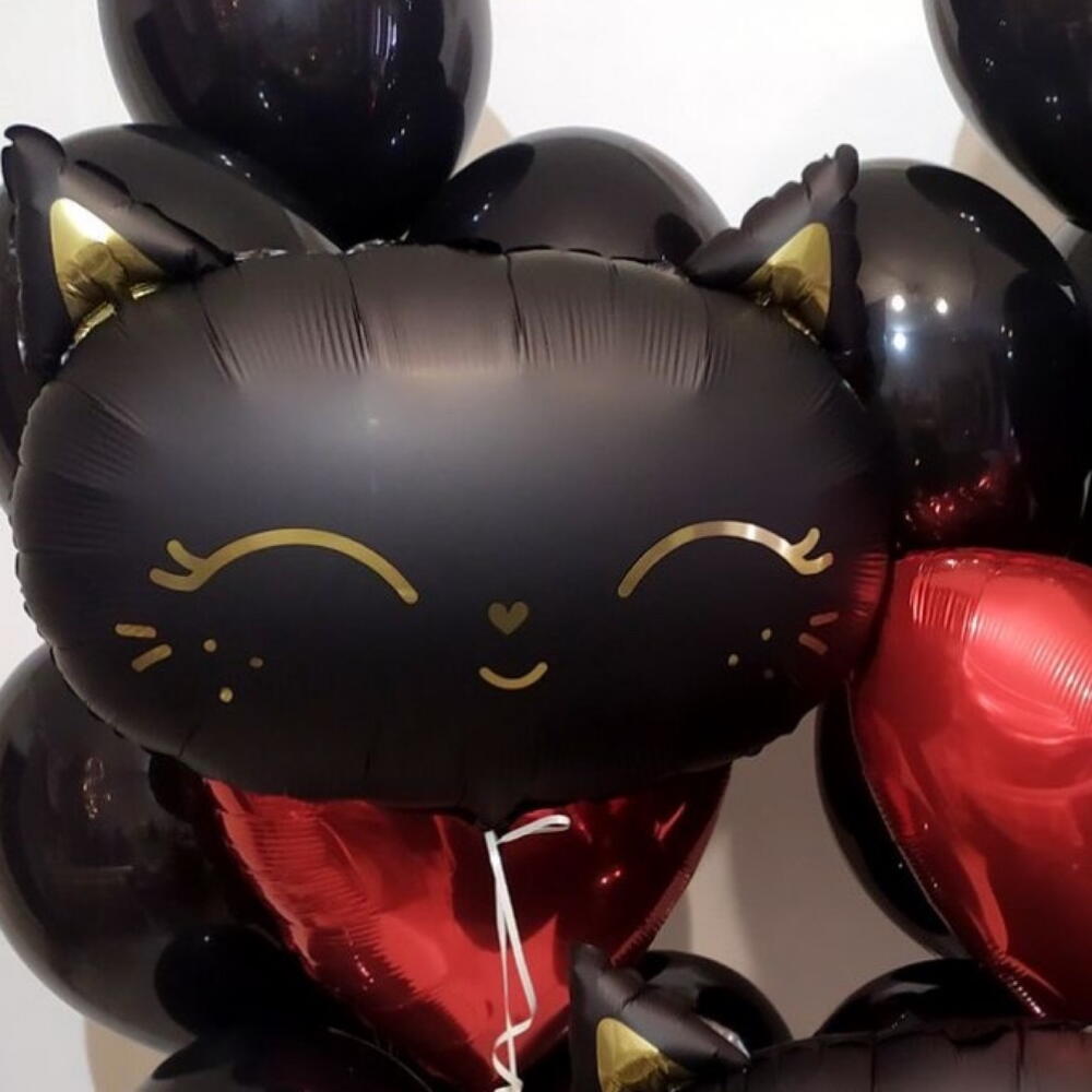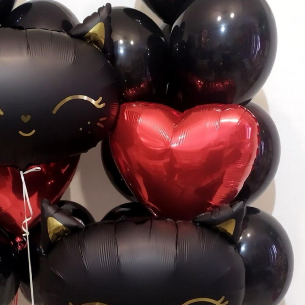 A bold and playful balloon arrangement featuring two big black cat foil balloons, glossy black balloons, and shiny red heart foils. Perfect for Valentine’s Day, romantic surprises, themed parties, or for cat lovers who want something fun and stylish.