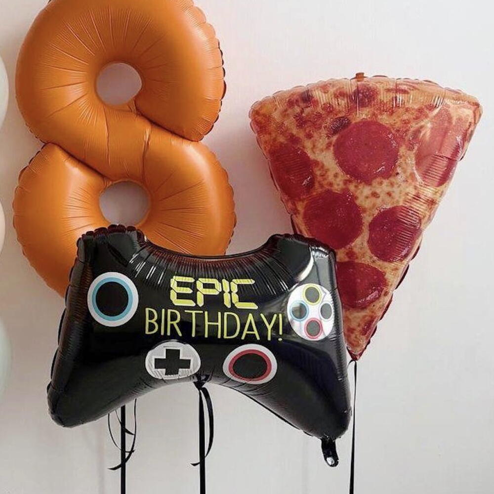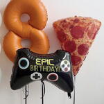 This fun and playful helium balloon set features a mix of pastel latex balloons, a number balloon, a game controller balloon, and a pizza slice balloon. A bold and cheerful decoration, perfect for birthdays, gaming fans, and fun-themed celebrations. Balloons are helium-inflated and delivered ready to enjoy.