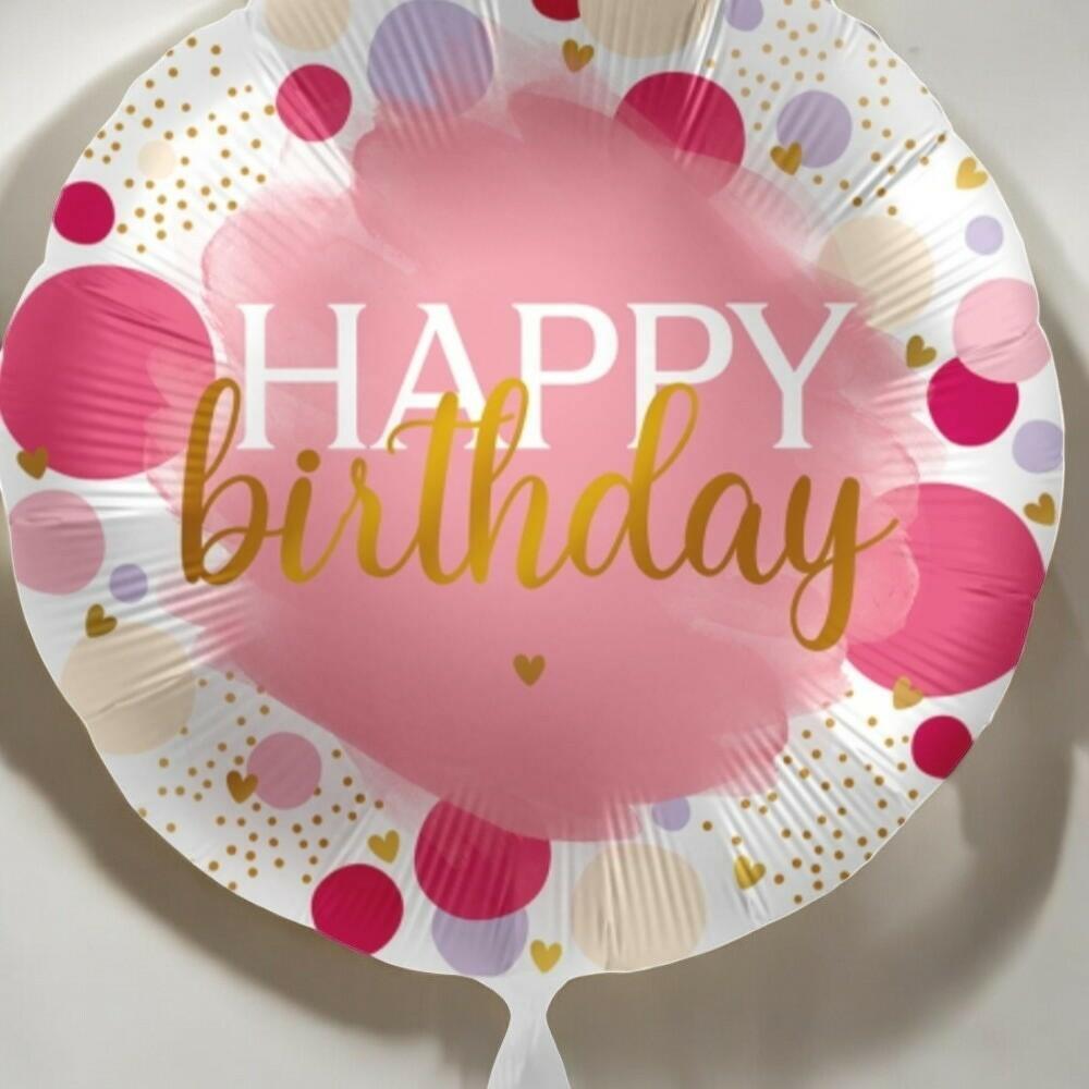 Add a pop of celebration to any birthday with this cheerful and festive foil balloon! Featuring a vibrant pink center with elegant white and gold Happy Birthday lettering, its adorned with playful polka dots and tiny golden hearts in shades of red, lilac, and beige. This balloon is perfect as a standalone gift or an add-on to a beautiful bouquet or gift bag. Its stylish and colorful design suits birthday parties for all ages and adds an instant festive vibe to any setting.