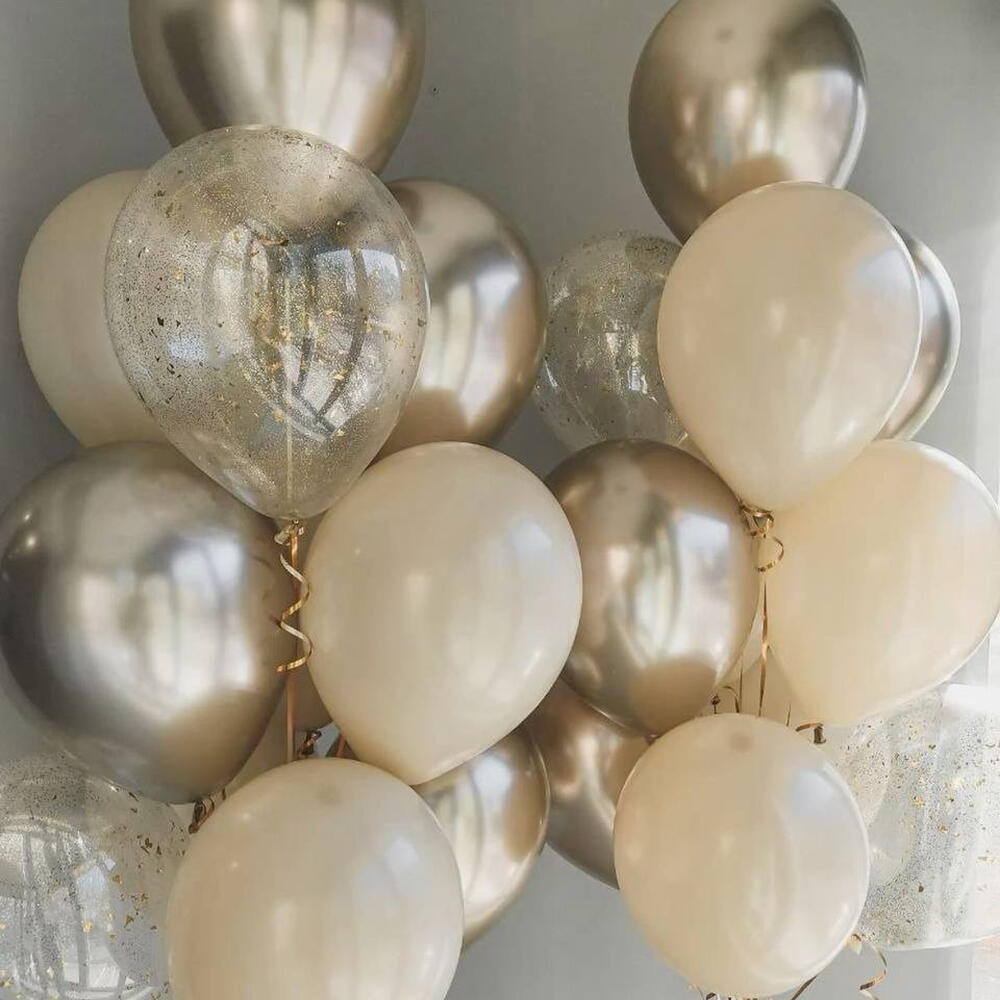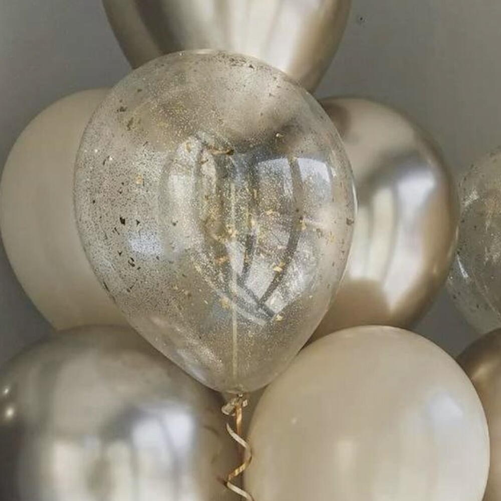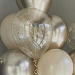 This elegant helium balloon set features a mix of soft beige, champagne, metallic silver, and transparent balloons with gold confetti. A stylish and modern decoration, perfect for birthdays, anniversaries, weddings, baby showers, and special celebrations. Balloons are helium-inflated and delivered ready to enjoy.