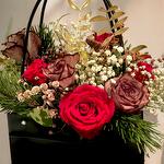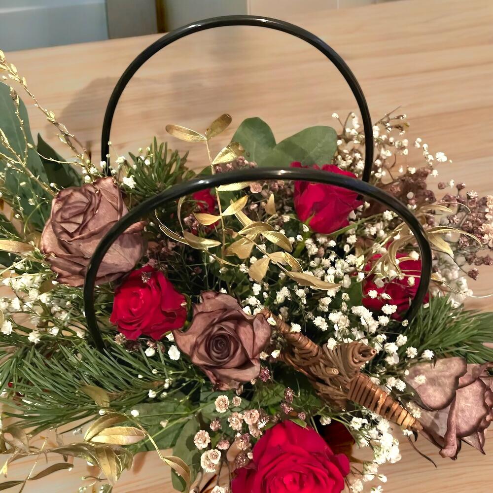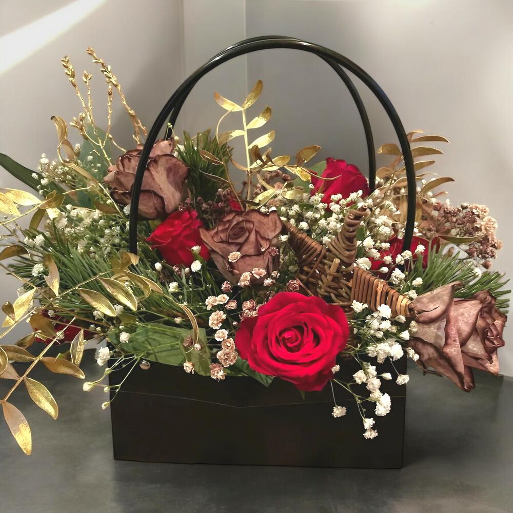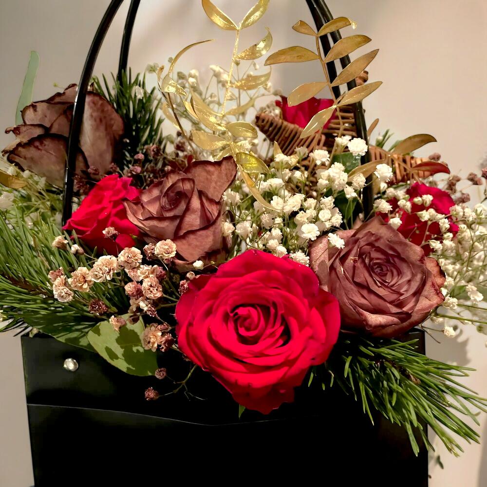Celebrate the holiday season with the Christmas Magic Flower Bag, a chic and festive floral arrangement designed in a sleek black bag with a stylish handle. Featuring 7 dyed roses in shades of deep red and cocoa brown, surrounded by decorative greenery and golden foliage, this piece is the perfect centerpiece or gift for Christmas gatherings. The dyed roses take 2 days to fully transform into their unique colors, so we recommend ordering in advance. You can also personalize the bag by adding your own small gift inside. Care Recommendations: Keep the arrangement in a cool area away from direct sunlight and heaters to preserve the dyed roses. Do not water the flowers directly, as they are treated for color. If you’re adding a gift inside, place it securely and ensure it is dry.