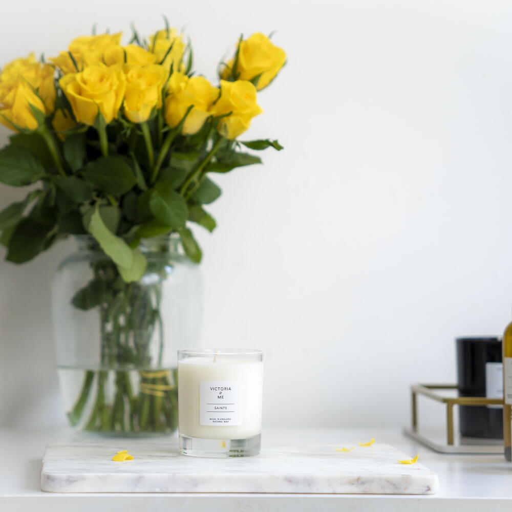 The Saints Candle has freshness of seaweed and ozone warmed by amber, patchouli and musk, this candle is a beautiful choice and a favourite . Scents of fresh coastal breeze as the refreshing aroma of seaweed and sweet ozone waft in. Floral notes of ;cyclamen is sweetened by the delicate waterlily, base notes of sparkling salt-crusted driftwood is warmed by rich amber, earthy patchouli and deep musk. Each Candle is carefully hand poured using Coconut wax and unbleached cotton wick. Burn time : 35 hours