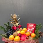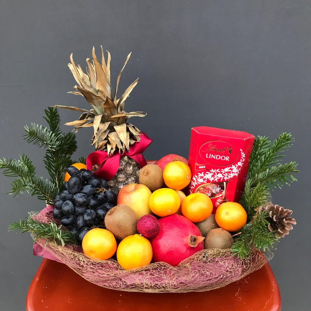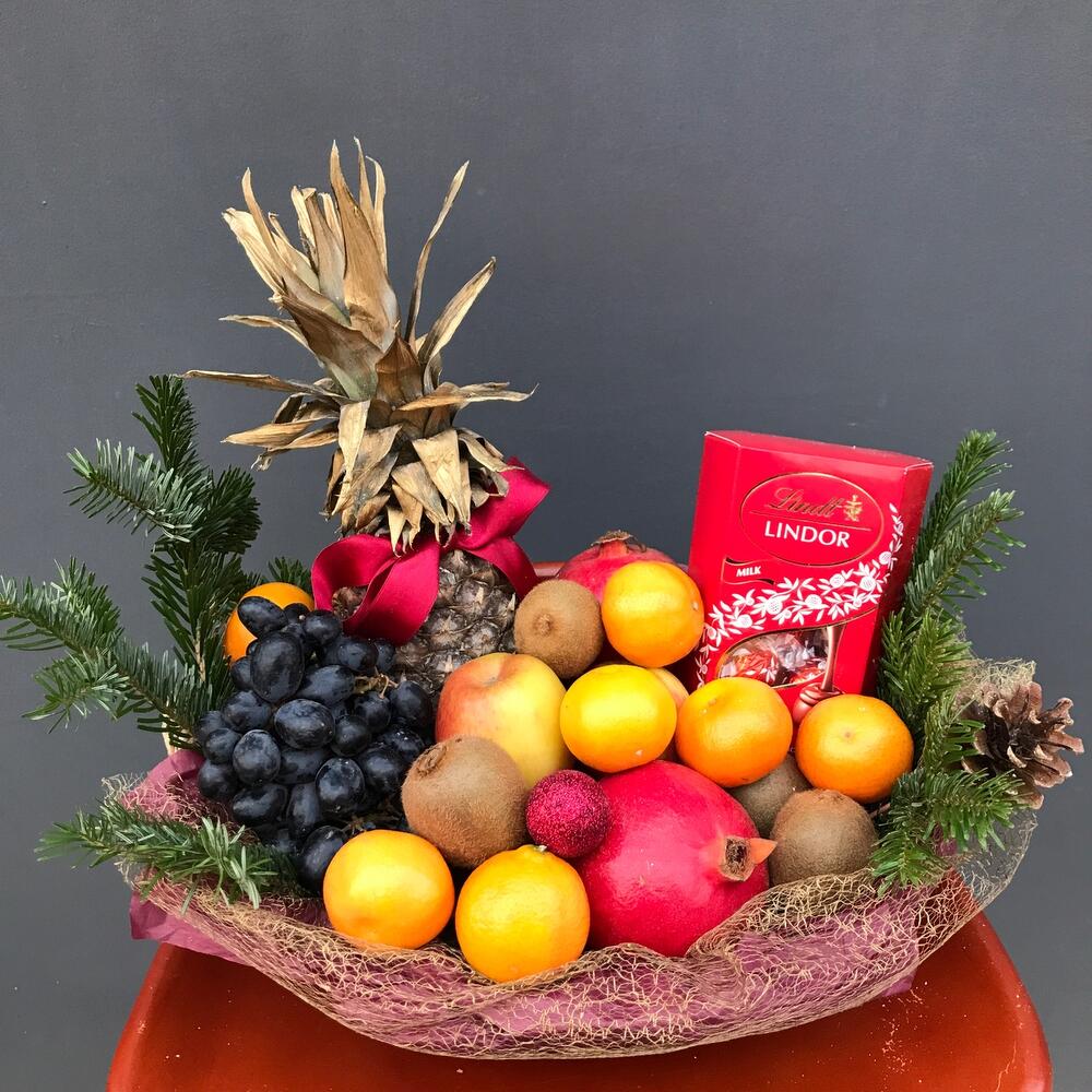 apples - 5 pcs kiwi - 4 pcs grapes - 1 pcs pomegranate red - 2 pcs pineapple - 1 pcs tangerines - 9 pcs lindt chocolate - 1 pcs