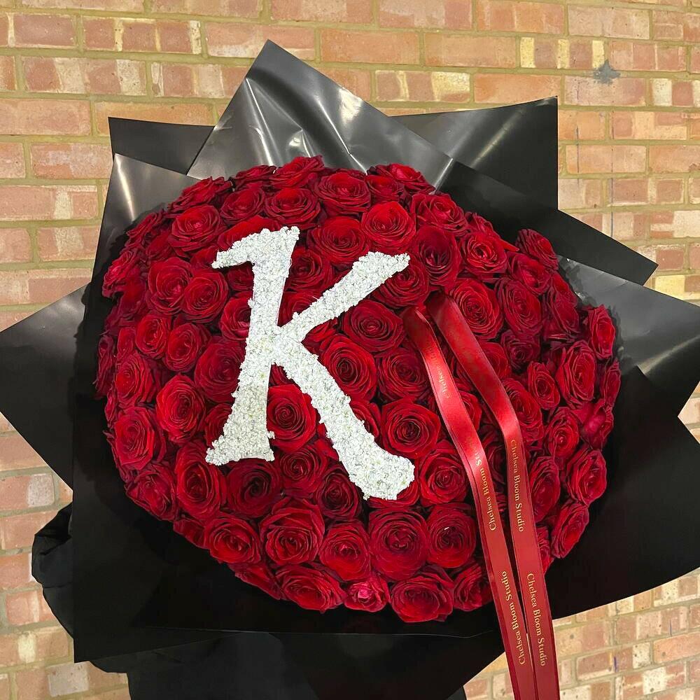 Make your message unforgettable with the “Initial Love” 100 Roses Arrangement – a striking floral masterpiece handcrafted from 100 velvety red roses, beautifully shaped into a dramatic heart-like design, featuring a custom white floral initial at the center. The bold red backdrop combined with a bright, contrasting monogram makes this bouquet the ultimate personalized romantic gesture. Care Instructions: Keep the bouquet in a cool indoor spot, away from direct sunlight. Lightly mist the base of the stems with water daily to maintain freshness. Avoid placing near radiators or heat sources.