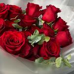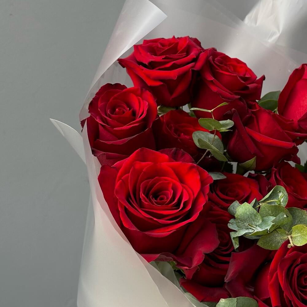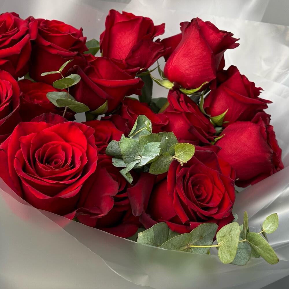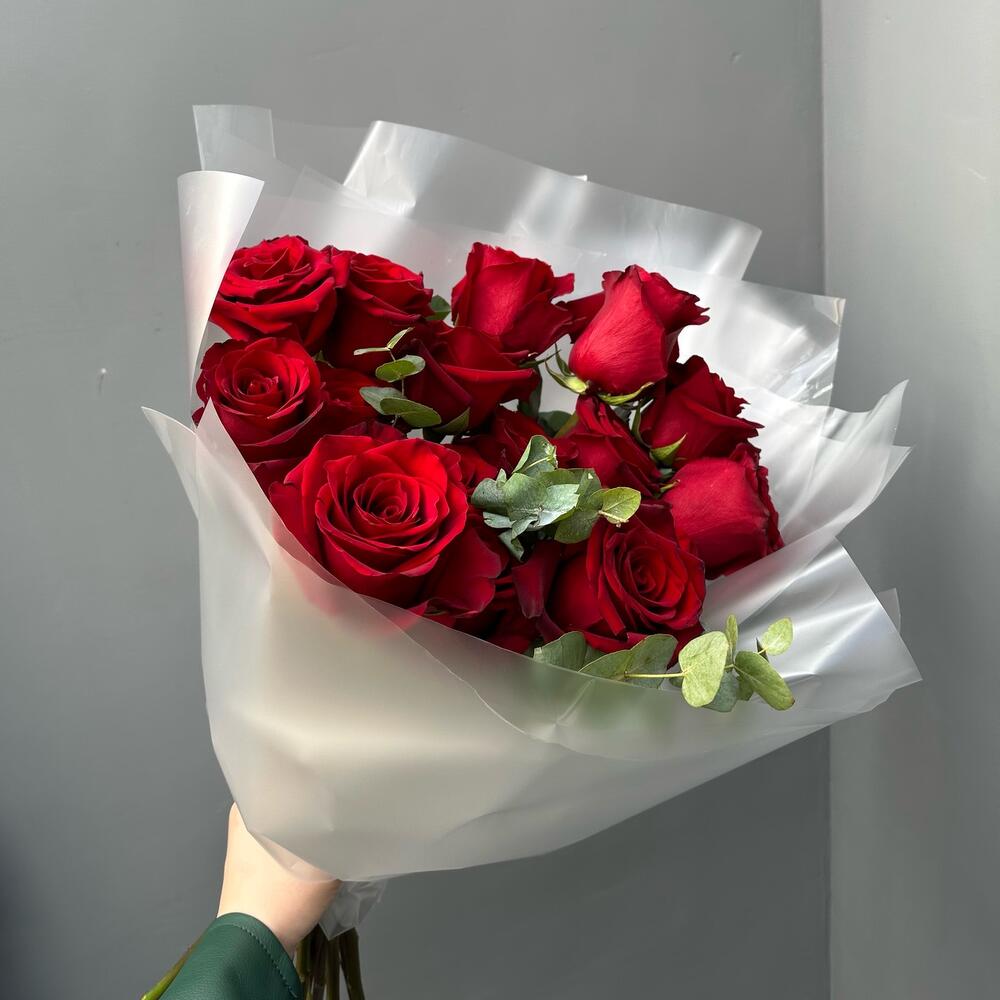 Red rose - 12 pcs Eucalyptus - 2 pcs packaging - 1 pcs