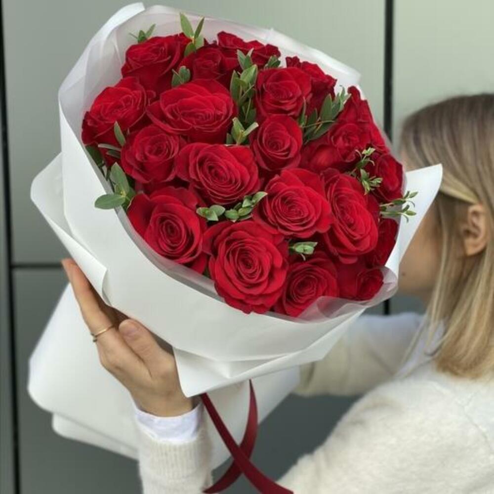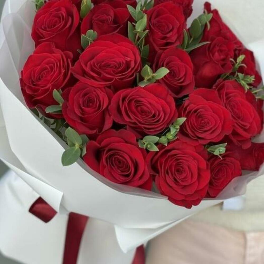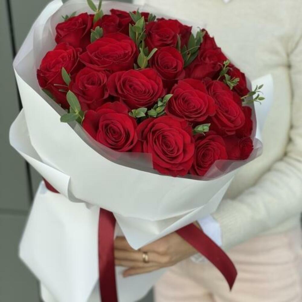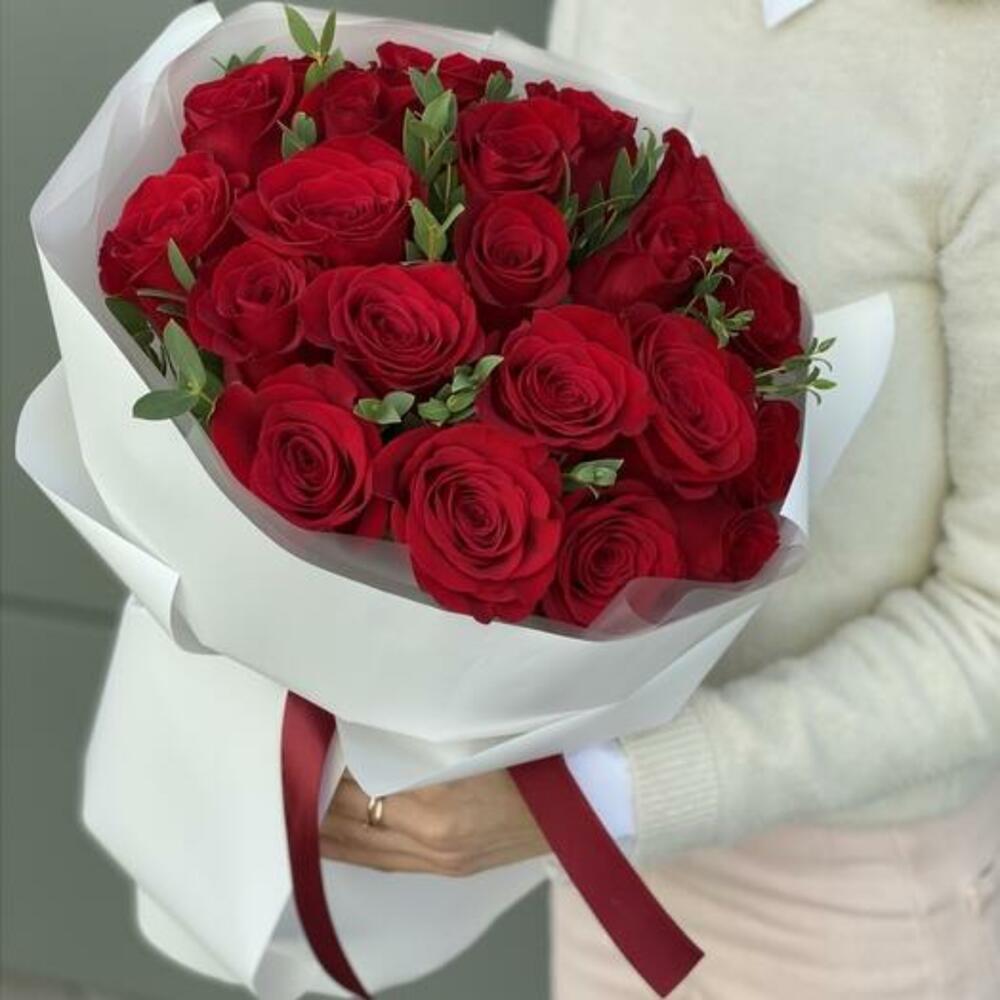 Ribbon - 1 pcs Eucalyptus - 3 pcs rose - 21 pcs packaging - 1 pcs