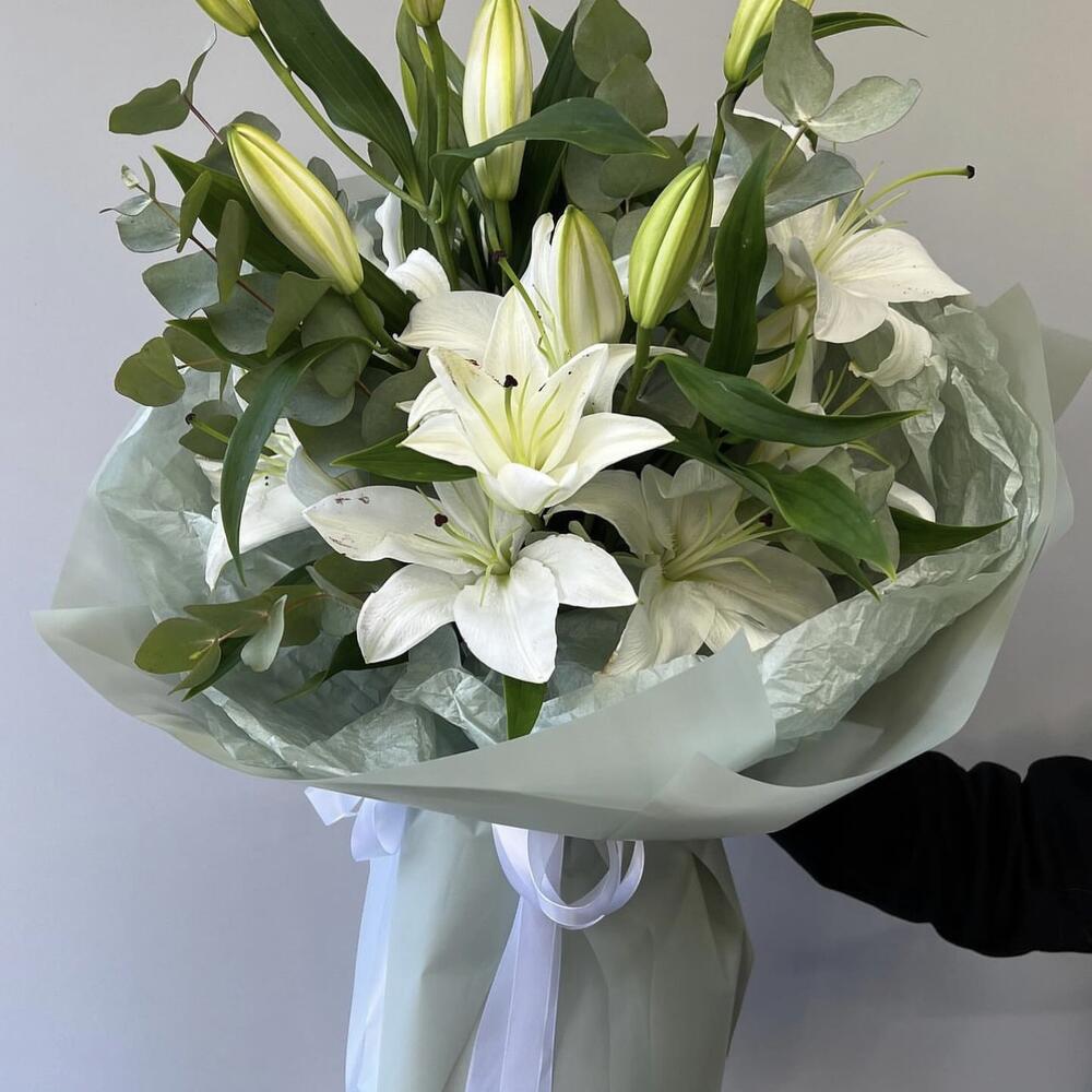 Eucalyptus - 5 pcs Lilies - 10 pcs white ribbon - 2 pcs olive wrapping - 4 pcs