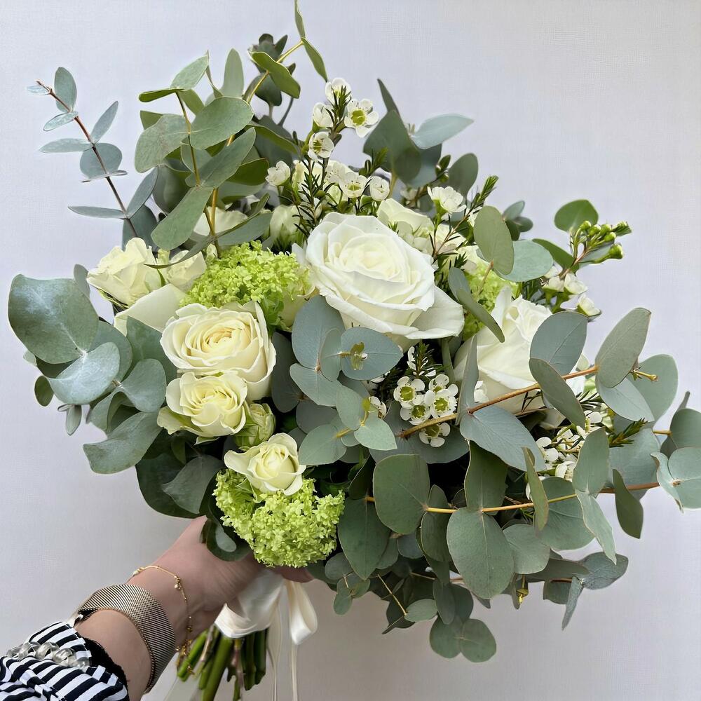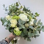 Eucalyptus - 6 pcs White rose - 3 pcs white spray rose - 3 pcs matricaria - 5 pcs
