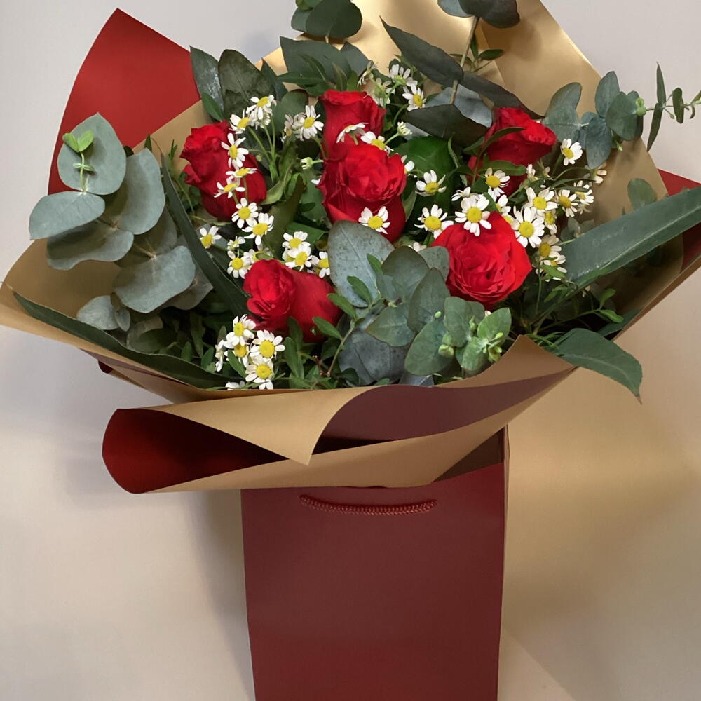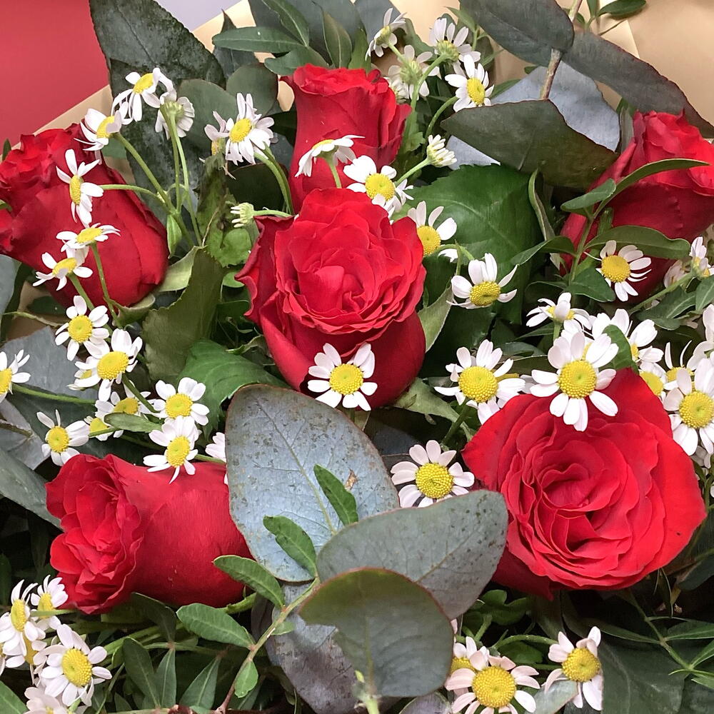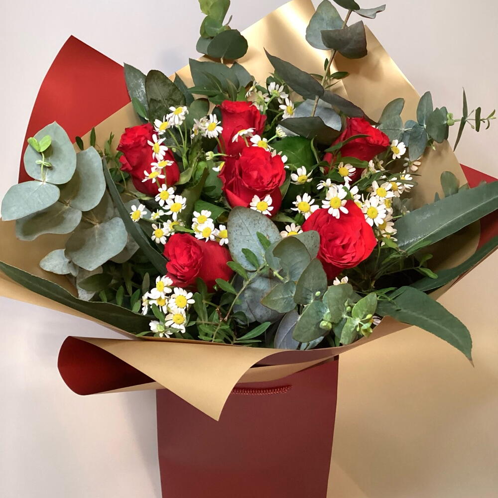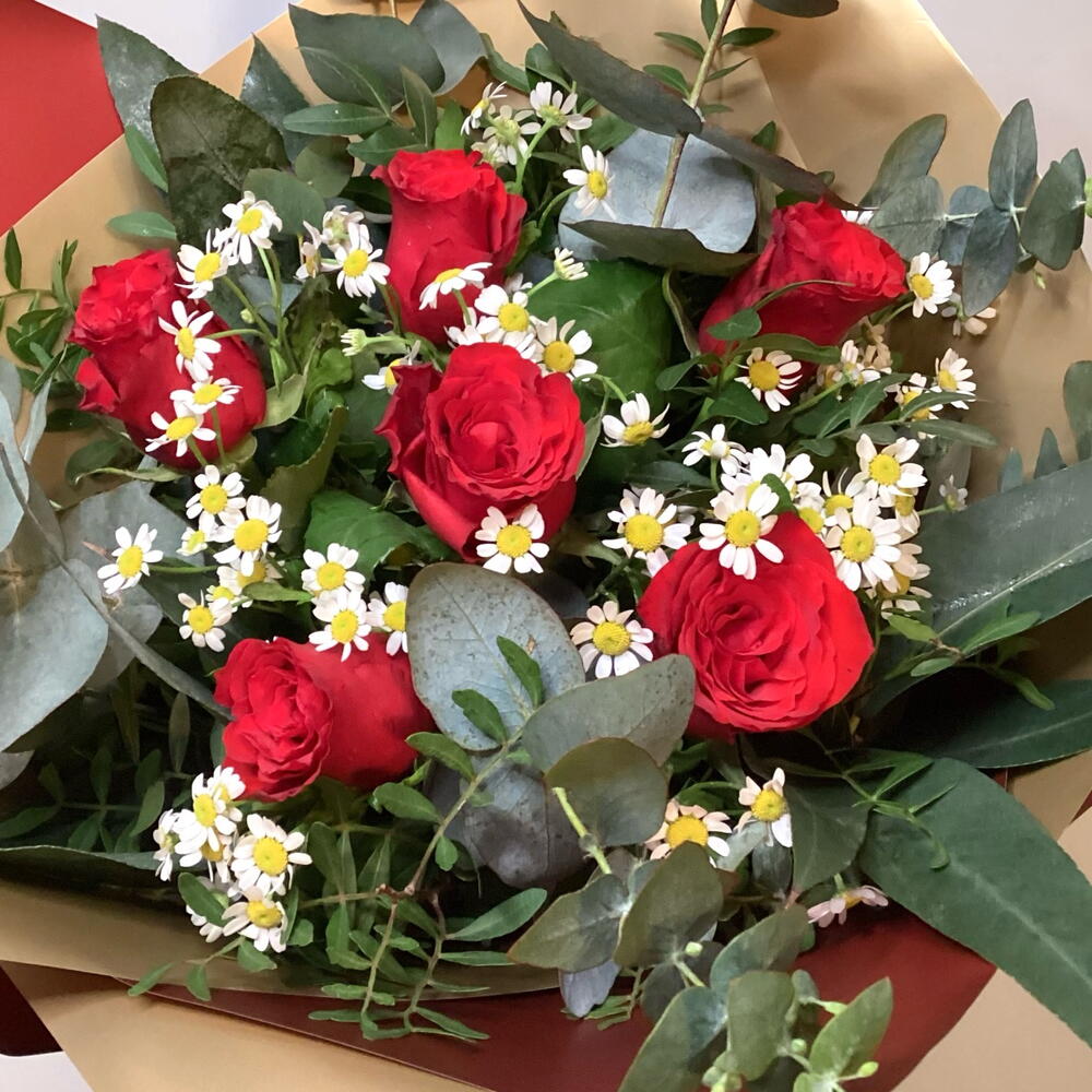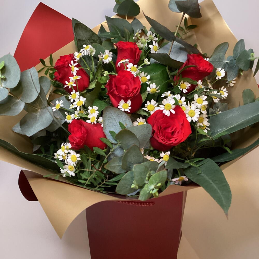 Romantic bouquet of six red roses, matricaria (chamomile daisy) and eucalyptus.