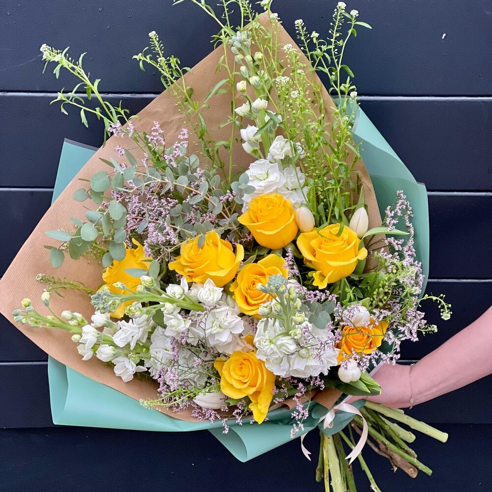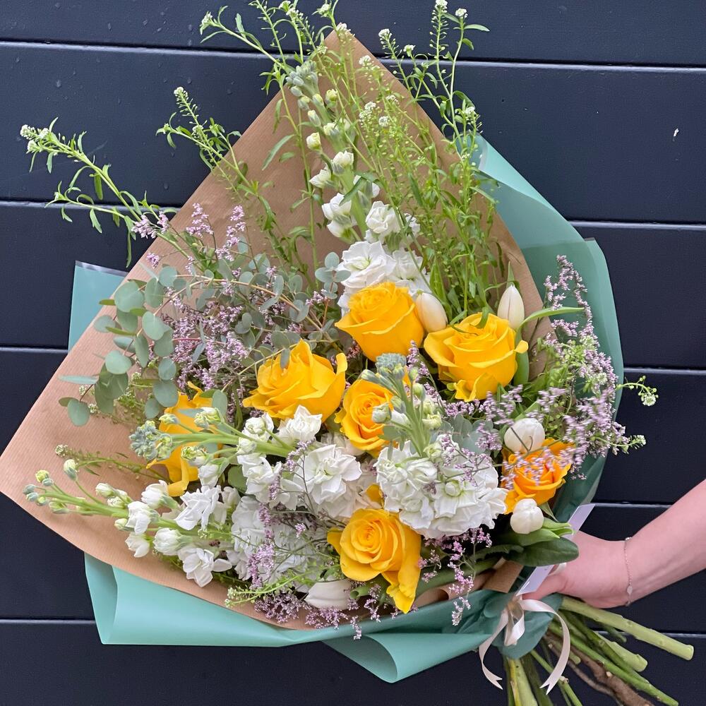 Introducing our beautiful Antonia bouquet - a stunning combination of vibrant yellow roses, delicate white tulips, fragrant white stock, and beautiful lilac limonium. Accented with fresh green bells, this bouquet is the perfect way to brighten up any room and put a smile on someone's face. Our expert florists carefully select each stem and artfully arrange them to create a unique and stunning bouquet that will leave a lasting impression. Whether you're celebrating a special occasion or just want to show someone you care, the Antonia bouquet is the perfect choice. Order now and let us help you make their day unforgettable!
