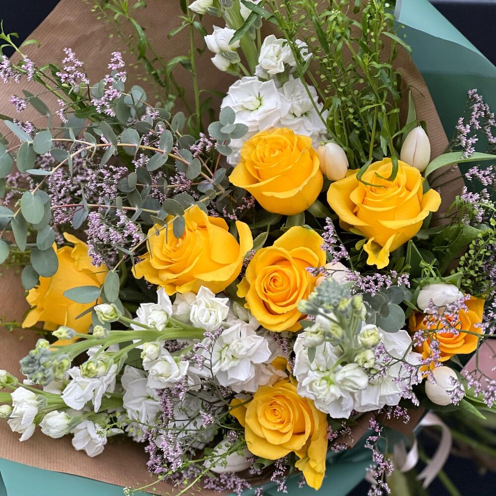 Yellow rose - 7 pcs Green bell - 1 pcs packaging - 1 pcs white tulip - 5 pcs white stock - 5 pcs lilac limonium (purple or pink) - 3 pcs