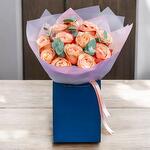 The "Apricot Sorbet" bouquet is a stunning arrangement of beautiful garden-like Kahala roses and fresh eucalyptus leaves. The bouquet features soft and delicate shades of peach, reminiscent of a sweet apricot sorbet on a warm summer day. The refreshing scent of the eucalyptus leaves adds a cooling touch to the warm tones of the bouquet, making it a perfect gift for any occasion. *Substitution Policy: Due to seasonal availability of certain flowers from time to time, we may use a substitution.