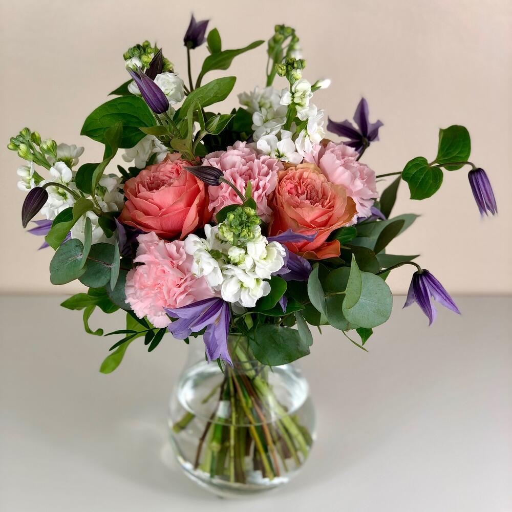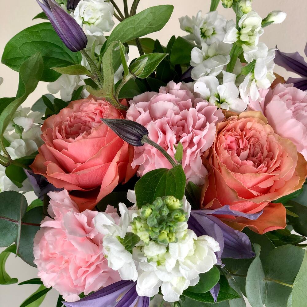 Eucalyptus - 3 pcs Clematis - 2 pcs Vase - 1 pcs orange rose - 2 pcs pink carnation - 3 pcs white stock - 3 pcs
