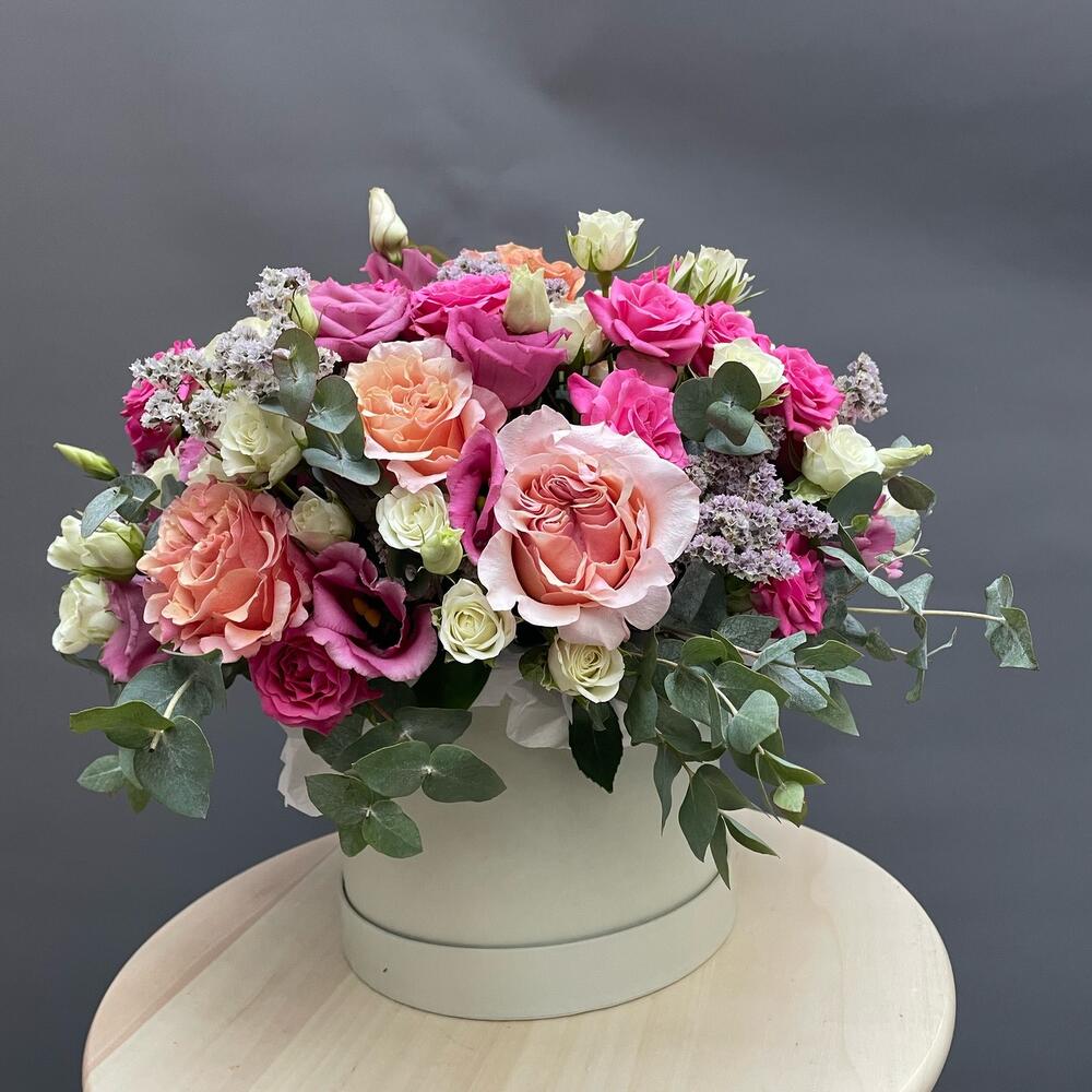 Eucalyptus - 5 pcs Spray rose - 5 pcs Box - 1 pcs Limonium - 3 pcs rose - 3 pcs paper - 1 pcs