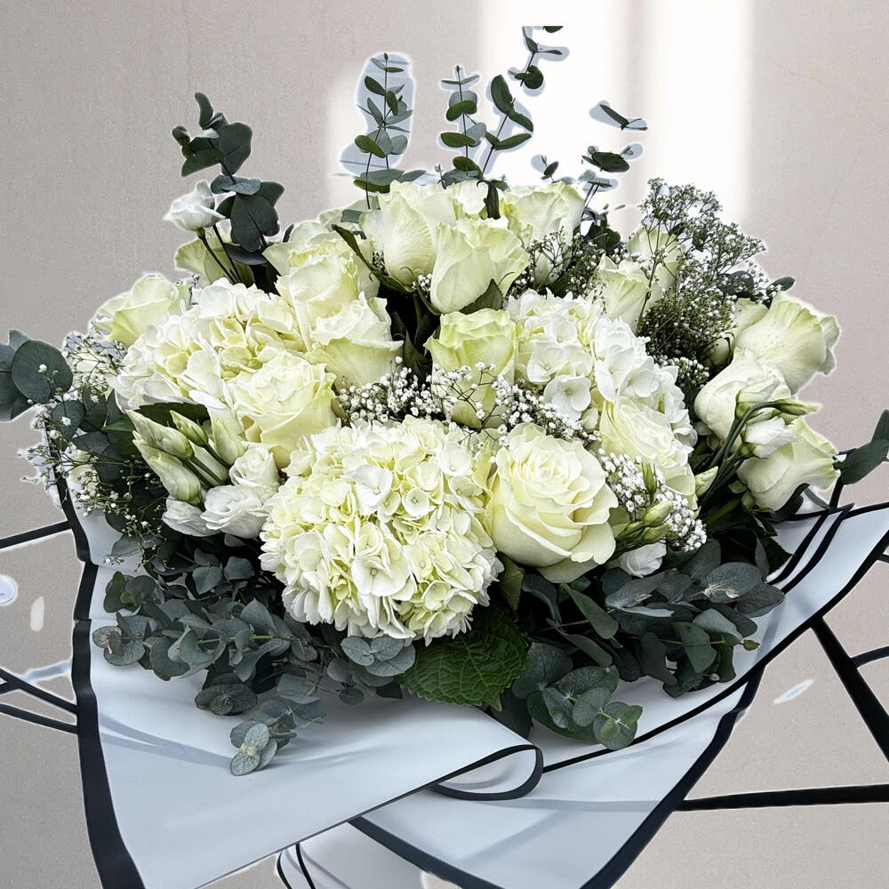 Eucalyptus - 10 pcs Gypsophila - 6 pcs hydrangeas - 5 pcs lisianthus white - 5 pcs white roses - 20 pcs