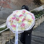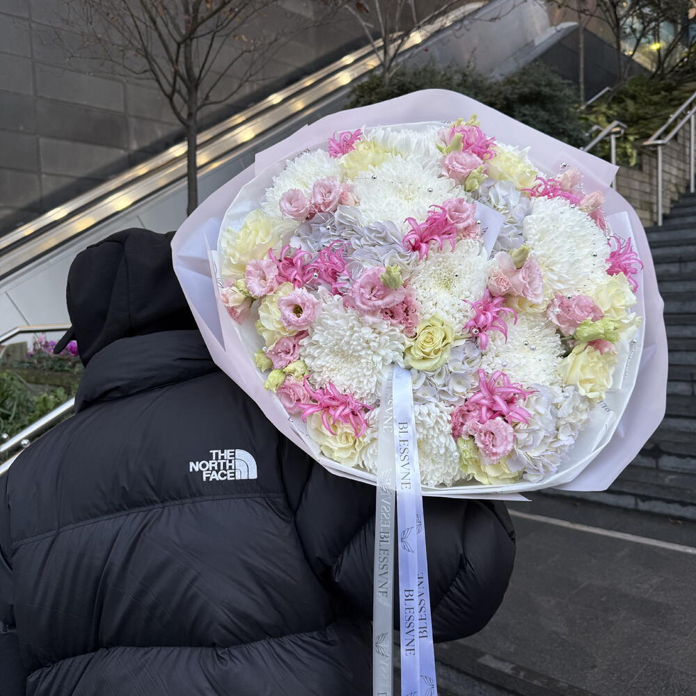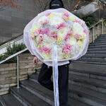 This is a wonderful monobouquet with a unique compositional balance. It can be successfully attributed to the ideals of floral design: imagine how 10 clustered chrysanthemums, 10 shy lisianthuses, 5 lush hydrangeas and 10 aristocratic French roses play simultaneously. The bouquet seems to be created for a gift from a queen: the flowers in turn show all the richness of natures colors, creating an atmosphere of luxury and exclusivity.