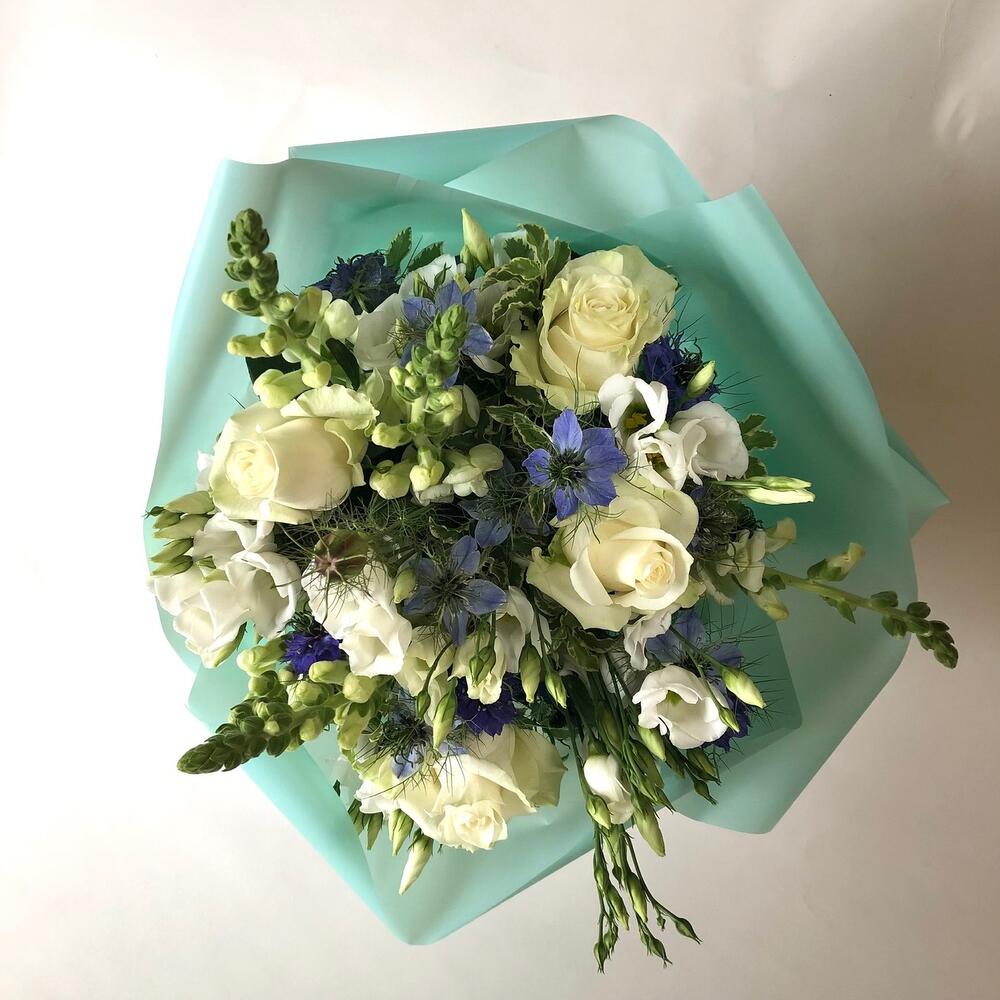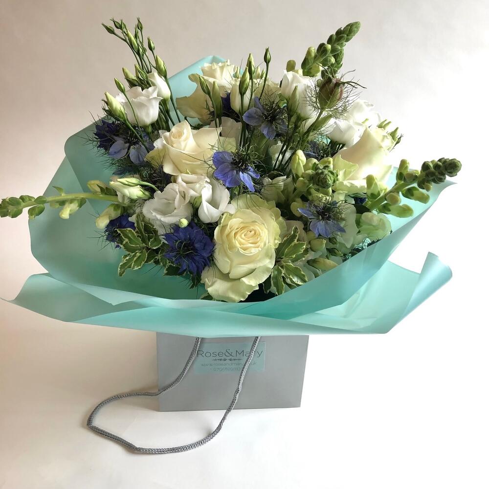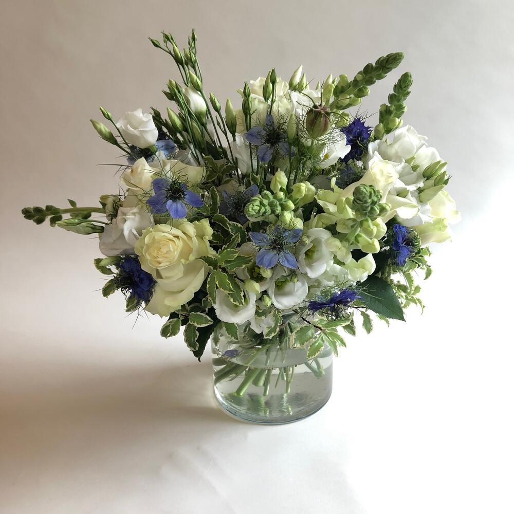 Elegant and chic flower arrangement in white and blue colours to celebrate any imaginable occasion!