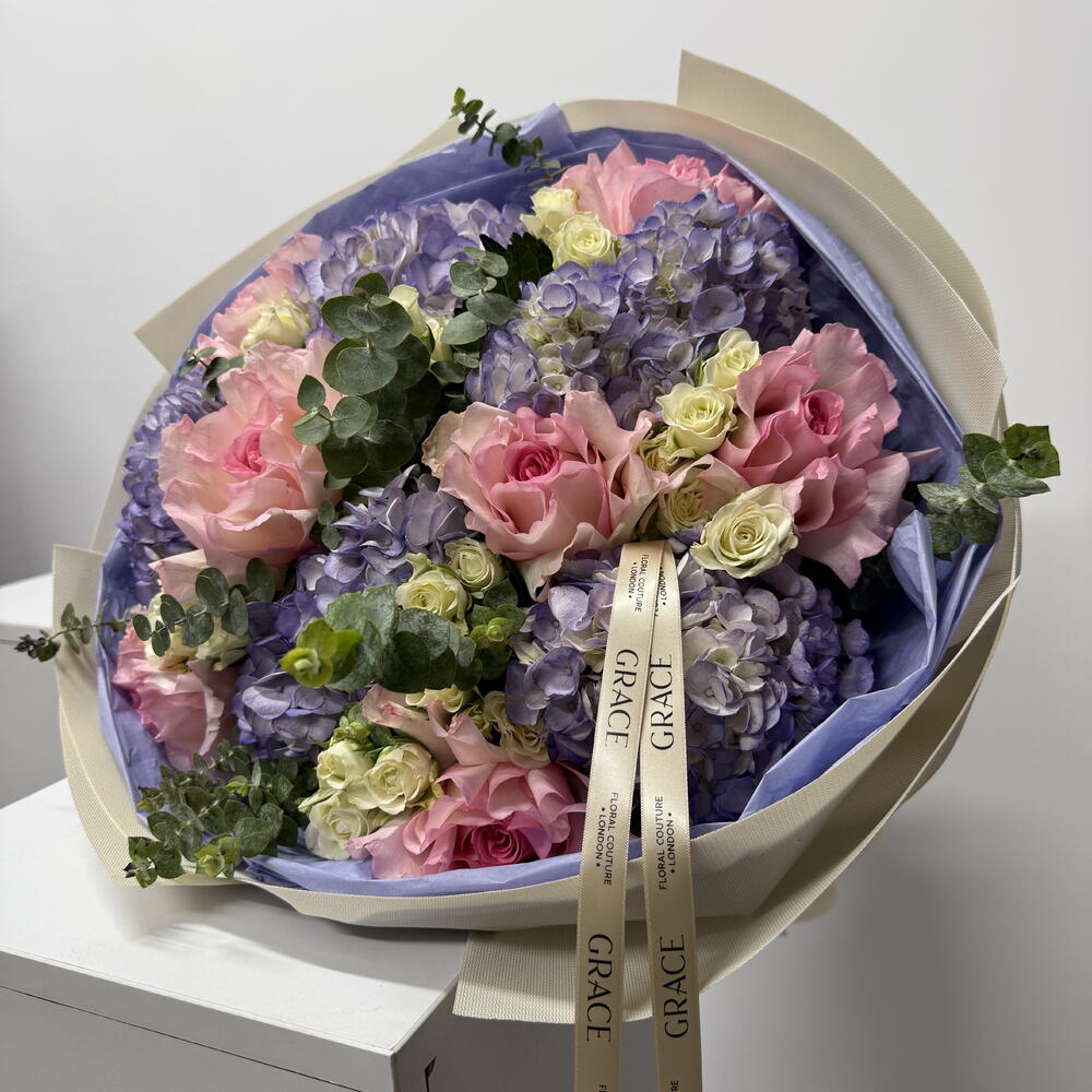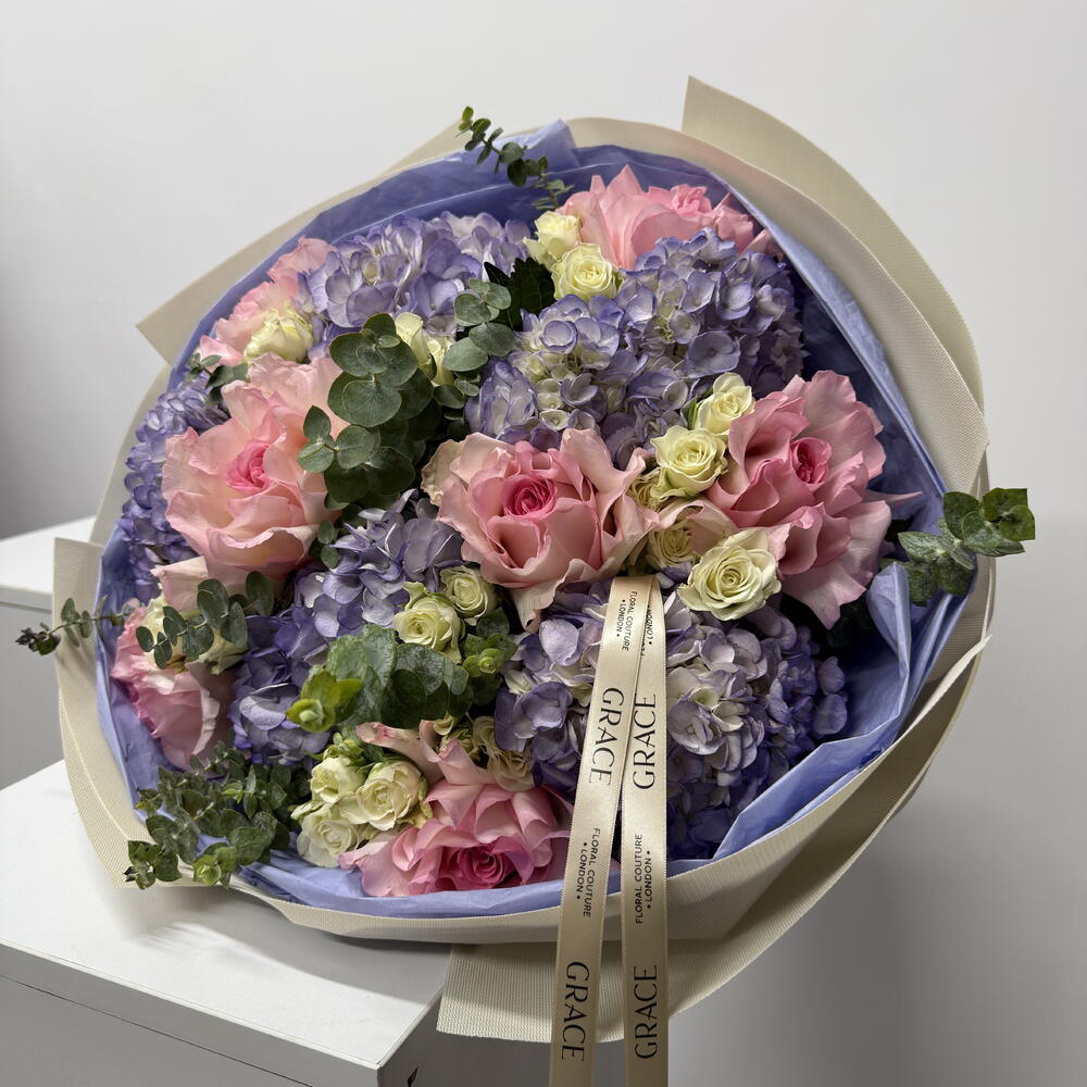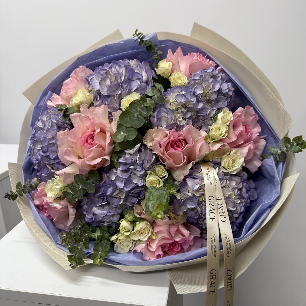 ecolyptus - 10 pcs spray roses - 10 pcs hydrangeas purple - 5 pcs rose mandala - 7 pcs