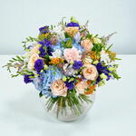 A soft yet vibrant mix of blue hydrangeas and purple lisianthus are dispersed throughout this bouquet. Celebrating the vibrancy of summer flowers and the unique pastel tones it brings with it. By mixing in peach roses and soft pink carnations this gathering of colours and flowers is one that is full of life and a feast for the eyes.