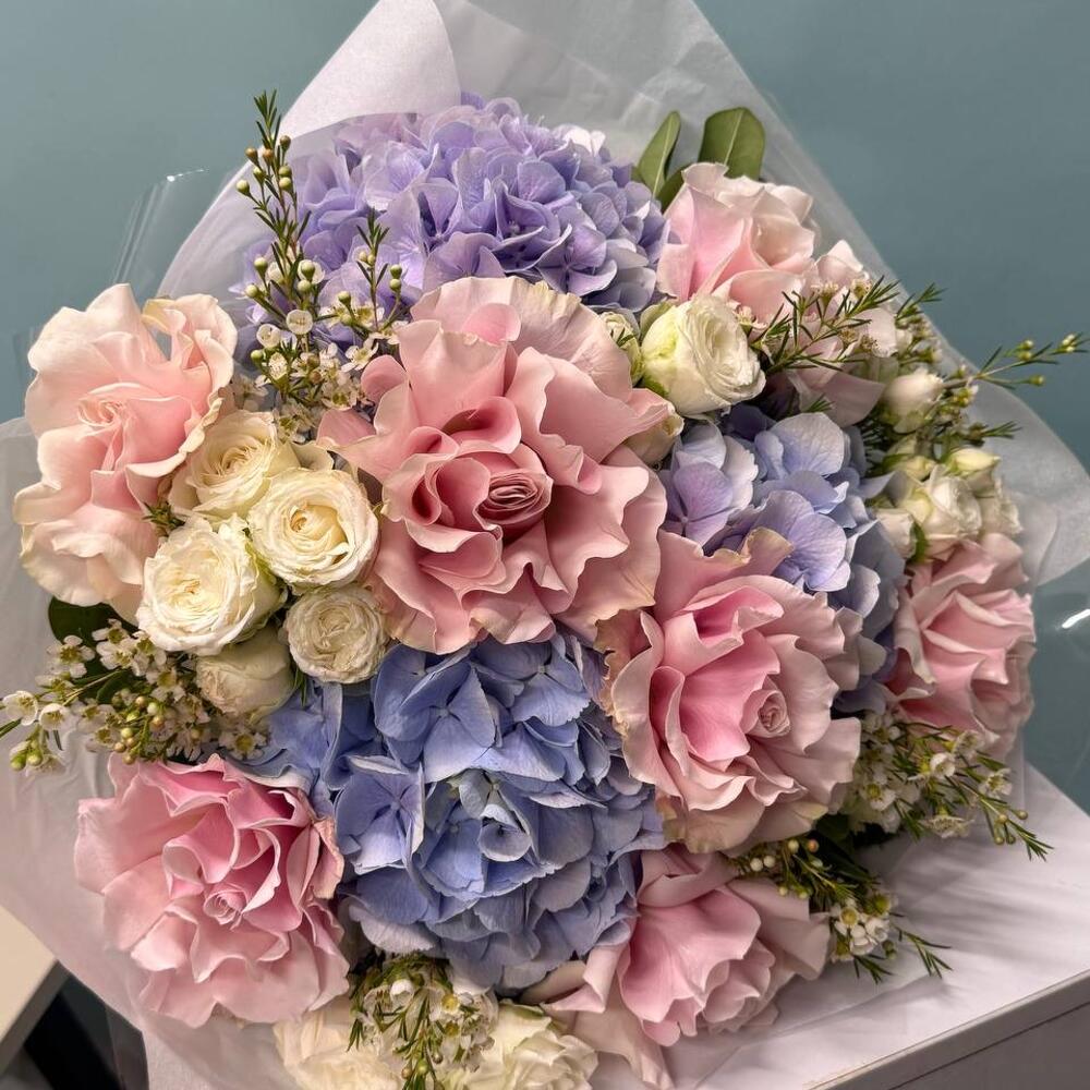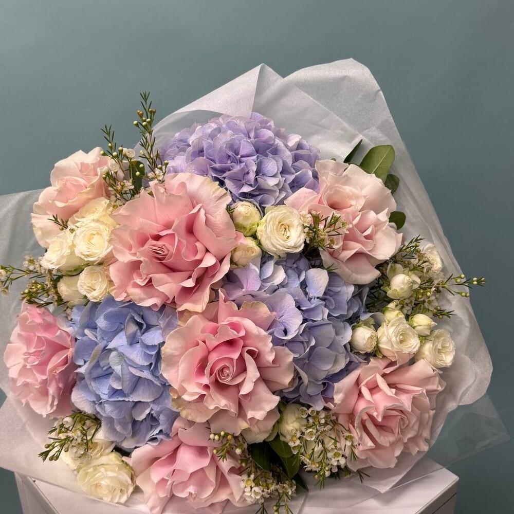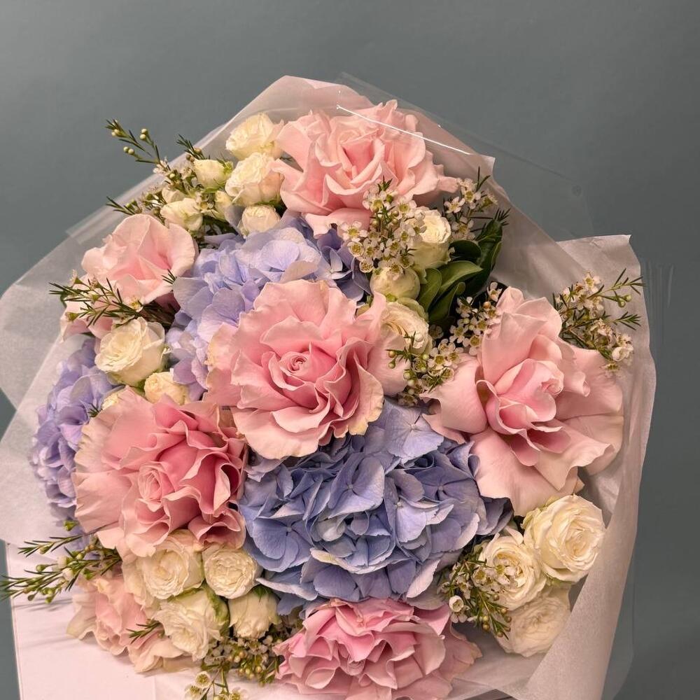 Wax flower - 4 pcs spray roses white - 5 pcs hydrangeas purple - 3 pcs roses mondial - 5 pcs