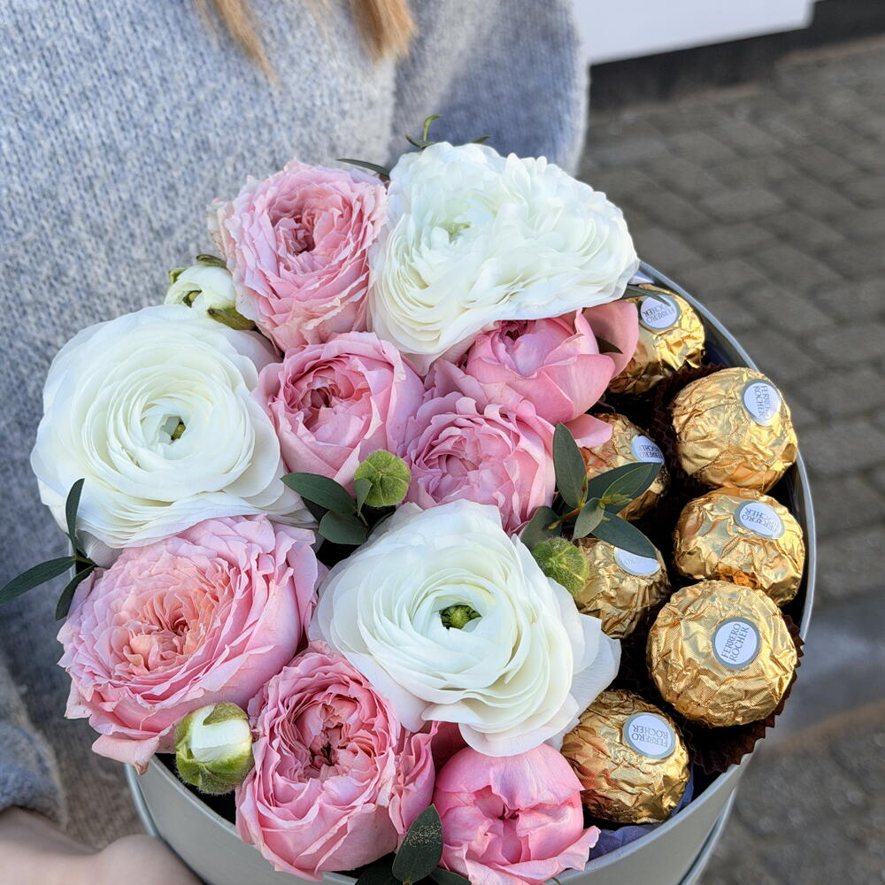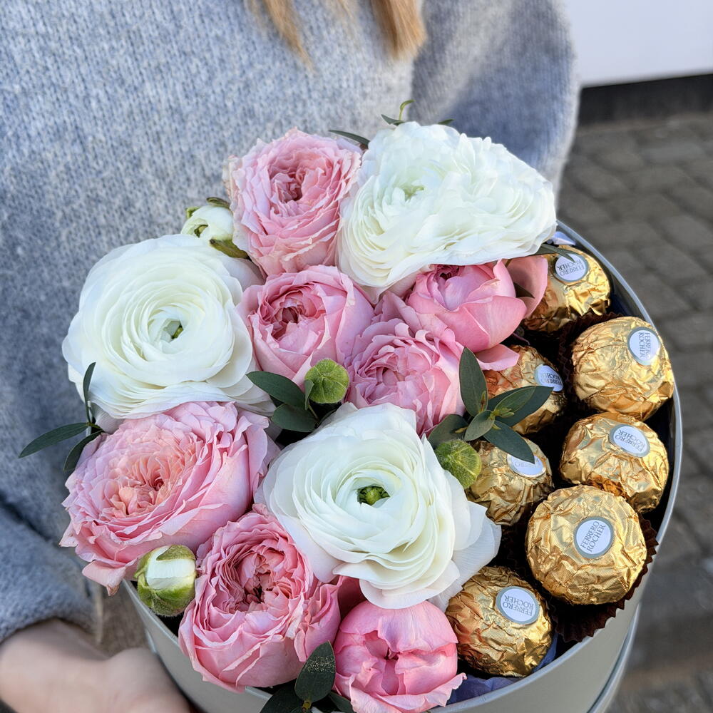 ranunculus - 3 pcs seasonal flowers - 2 pcs ferrero rocher chocolates - 12 pcs hat box with ribbon - 1 pcs Eucalyptus systems - 2 pcs garden roses - 5 pcs
