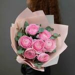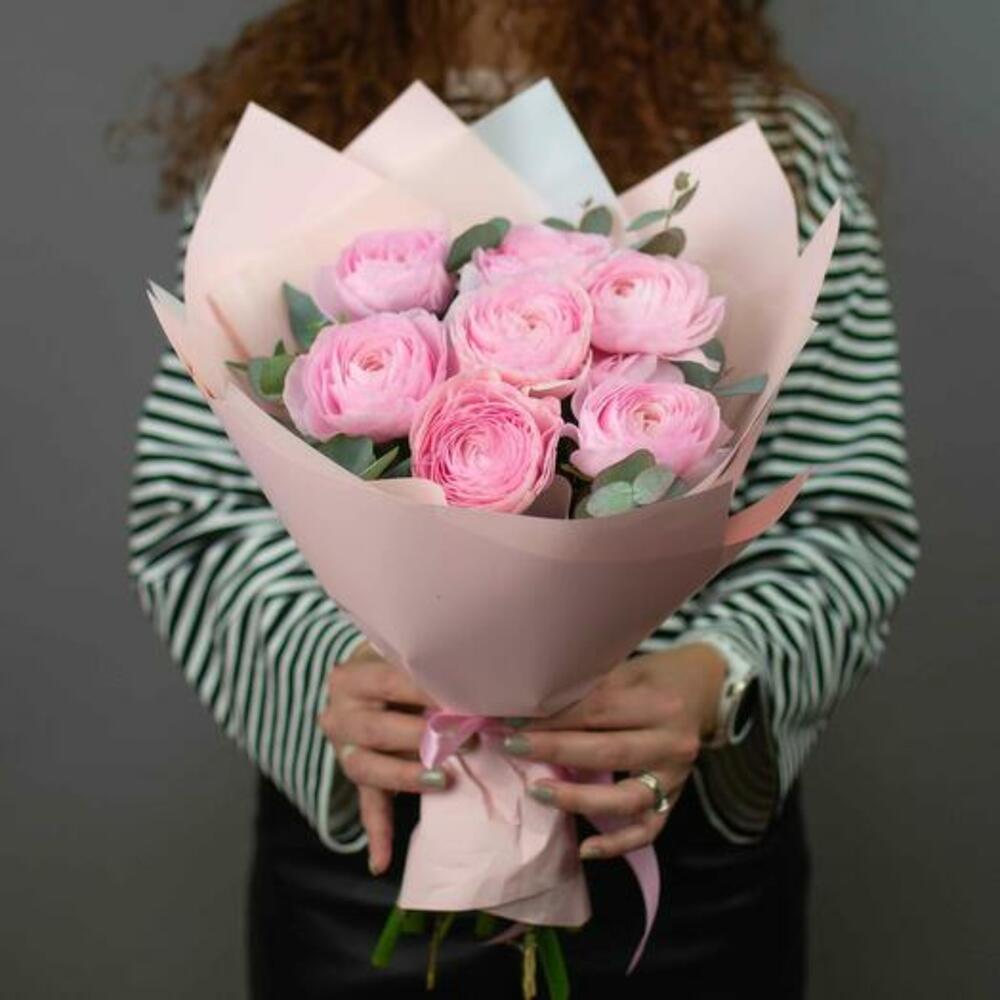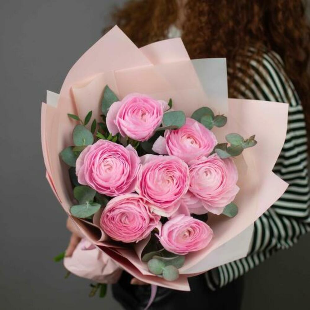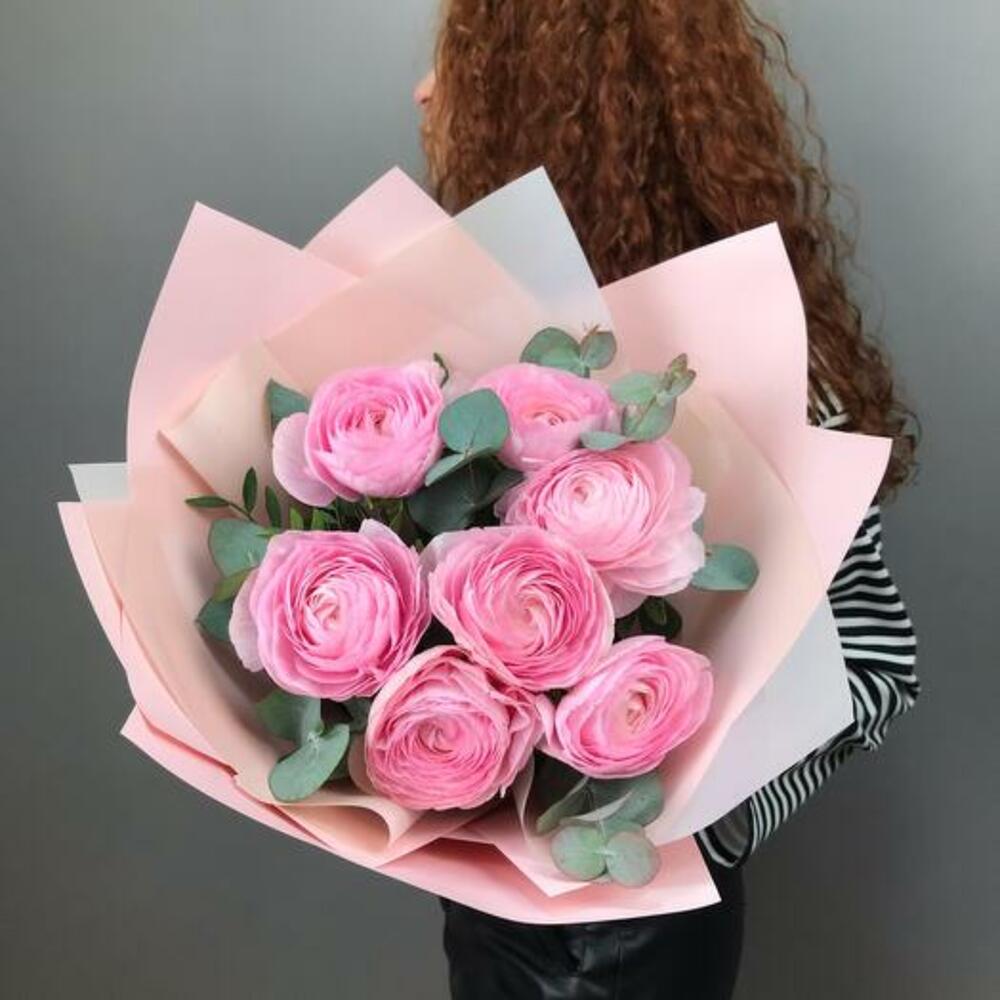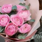 Eucalyptus - 1 pcs Pistachio - 1 pcs ranunculus - 7 pcs design packaging - 1 pcs