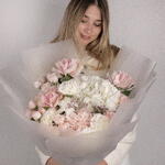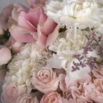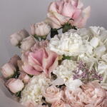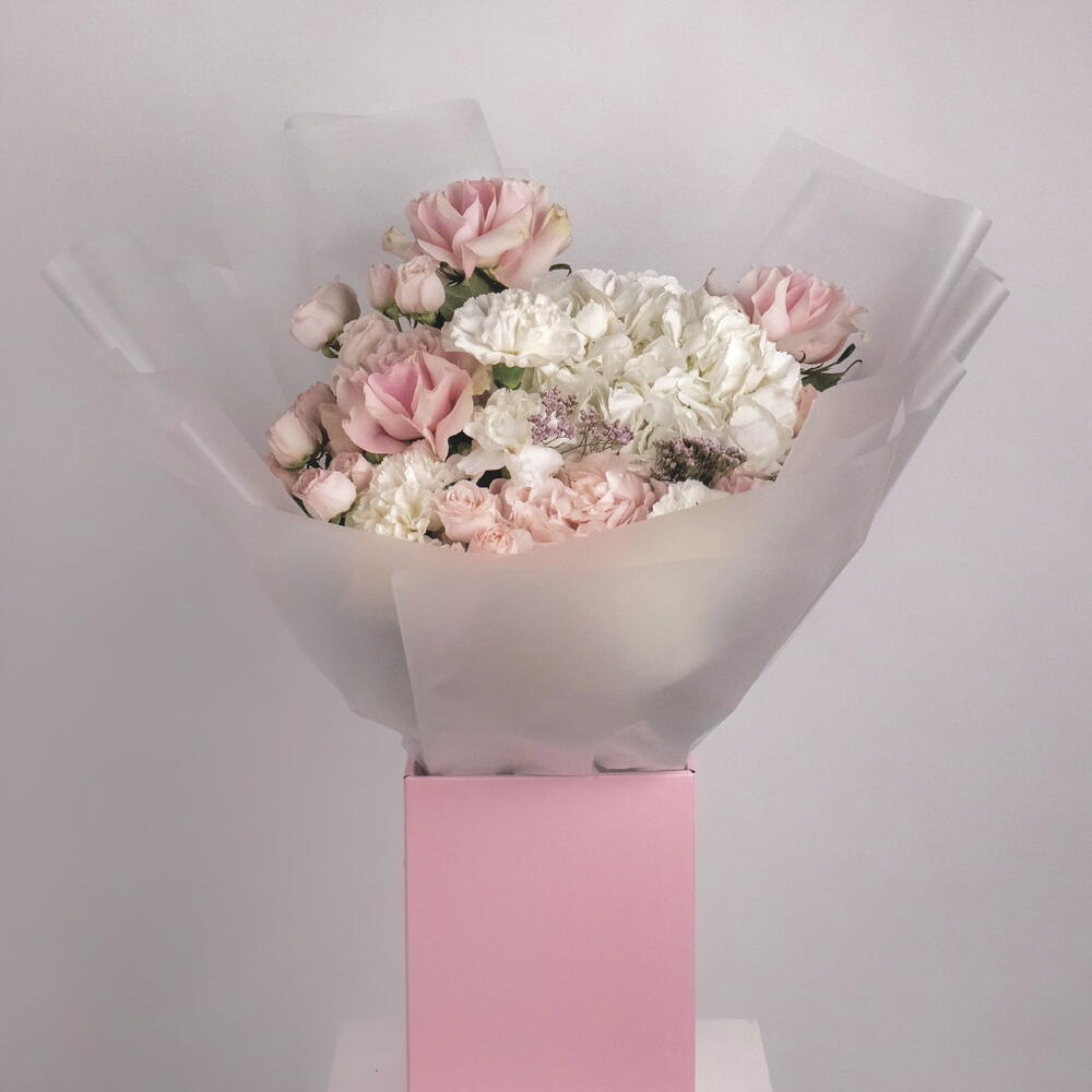 This is a delicate bouquet of soft pink and white flowers, including roses and carnations, elegantly wrapped in translucent paper for a dreamy and romantic touch.
