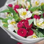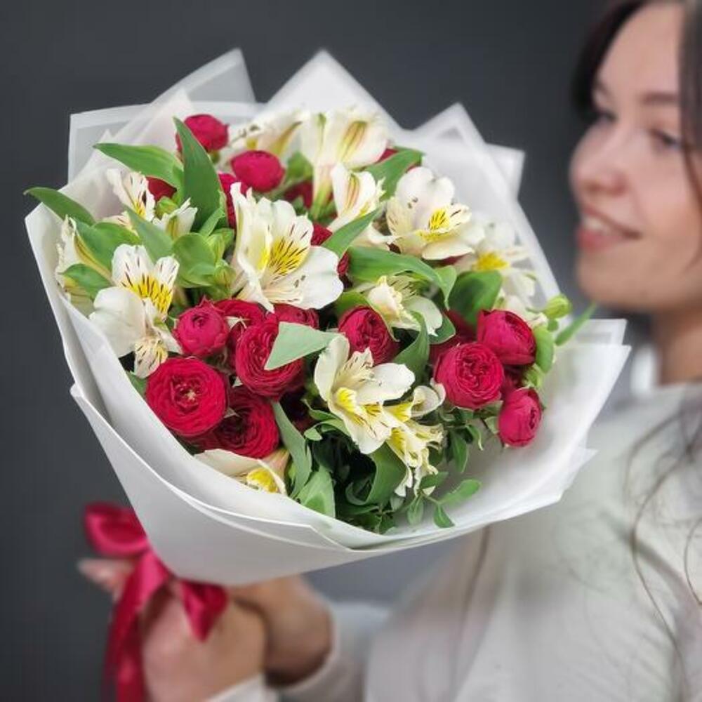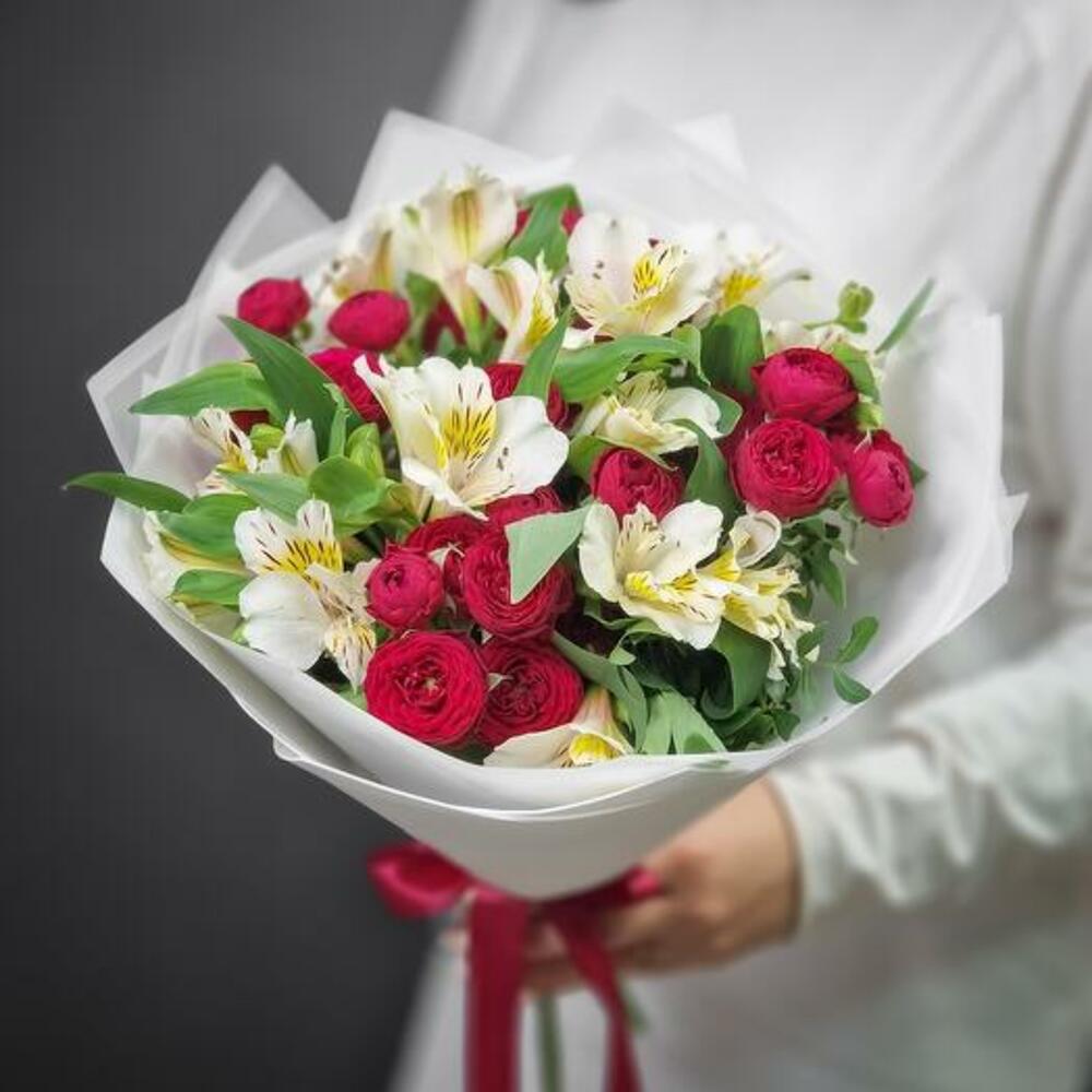 Indulge in the captivating beauty of our bouquet, featuring a stunning combination of pure white alstroemeria and rich burgundy spray roses. This elegant arrangement brings together the delicate charm of alstroemeria with the deep, passionate hues of spray roses, creating a harmonious blend of sophistication and romance.