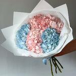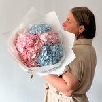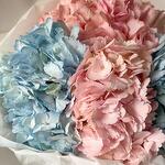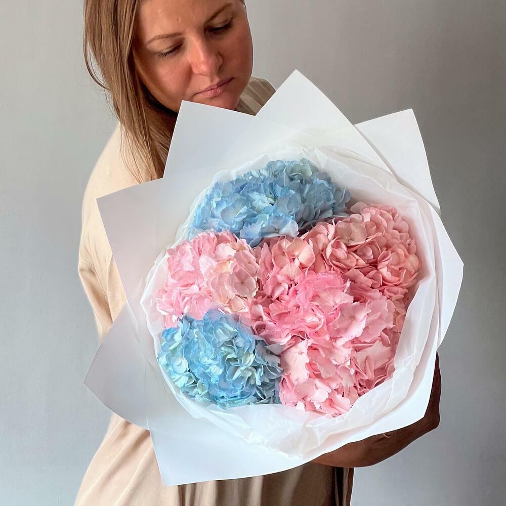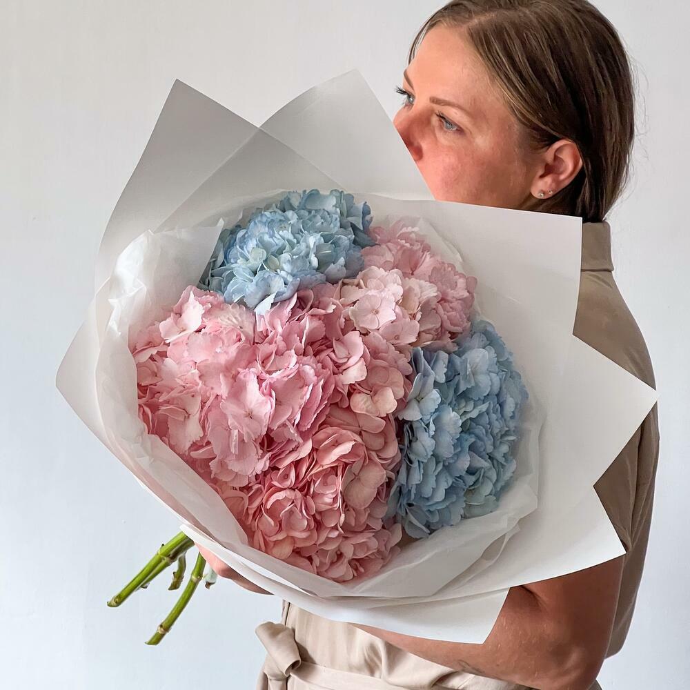 Bouquet of pink and blue hydrangeas. This is the perfect bouquet for making someone's day special. Here’s a flower care tip: at home, we recommend using plant food to make cut flowers last longer, along with the joy of the gift.