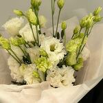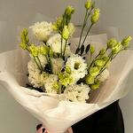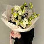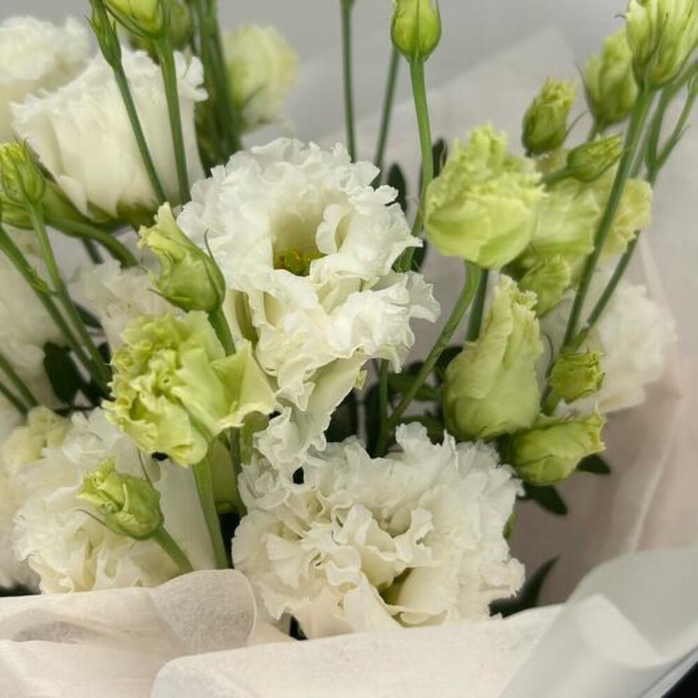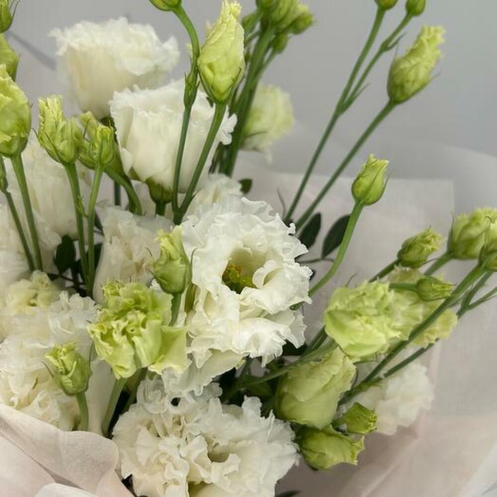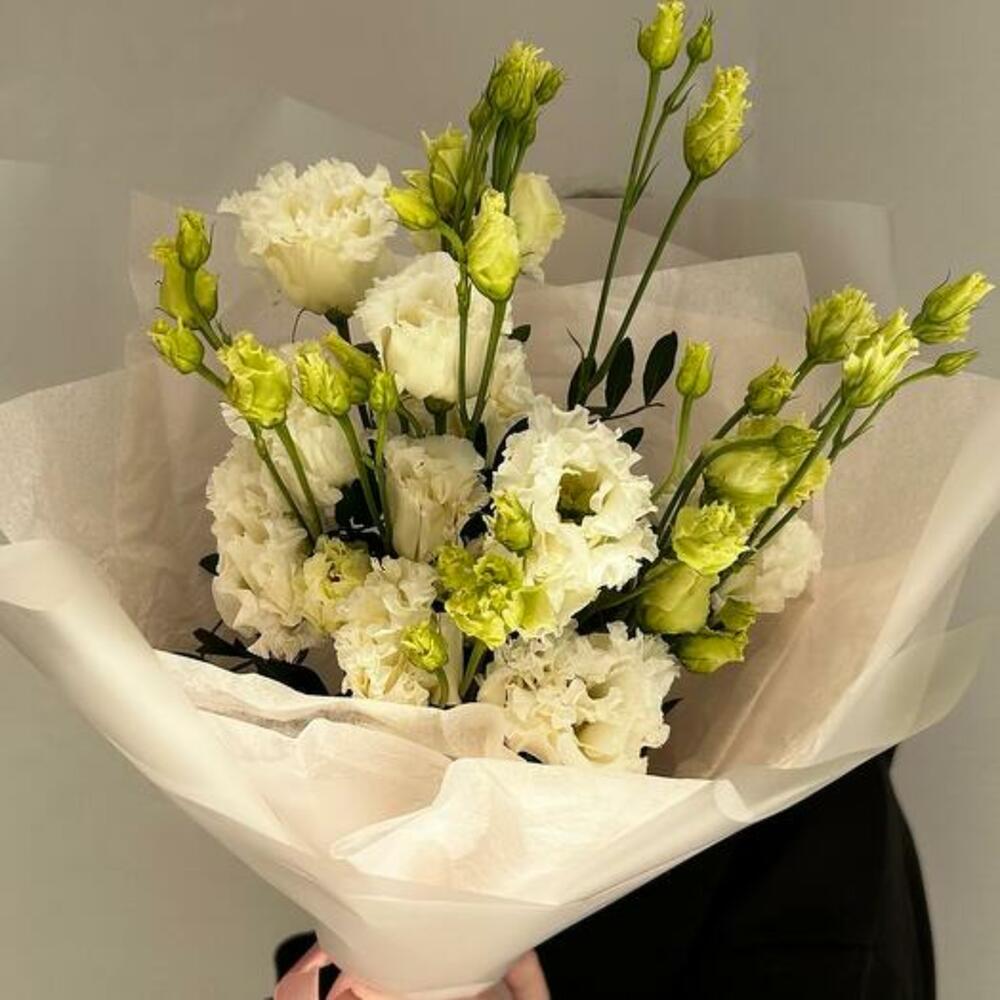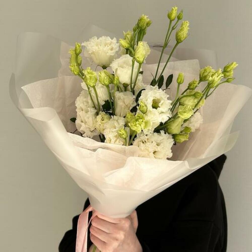 Satin ribbon - 1 pcs designer packaging - 2 pcs decorative greenery - 1 pcs white terry eustoma - 3 pcs