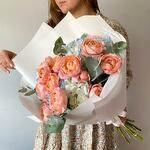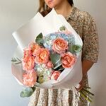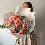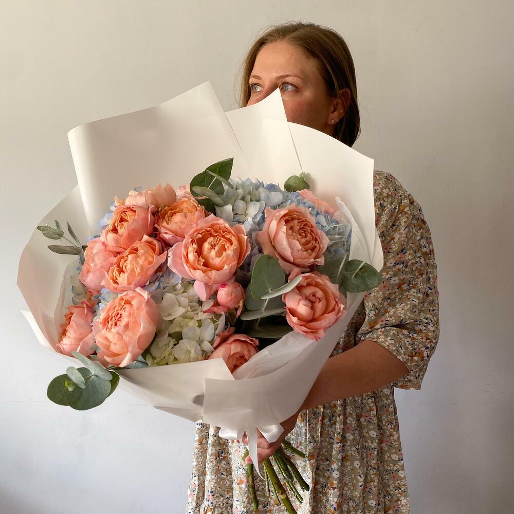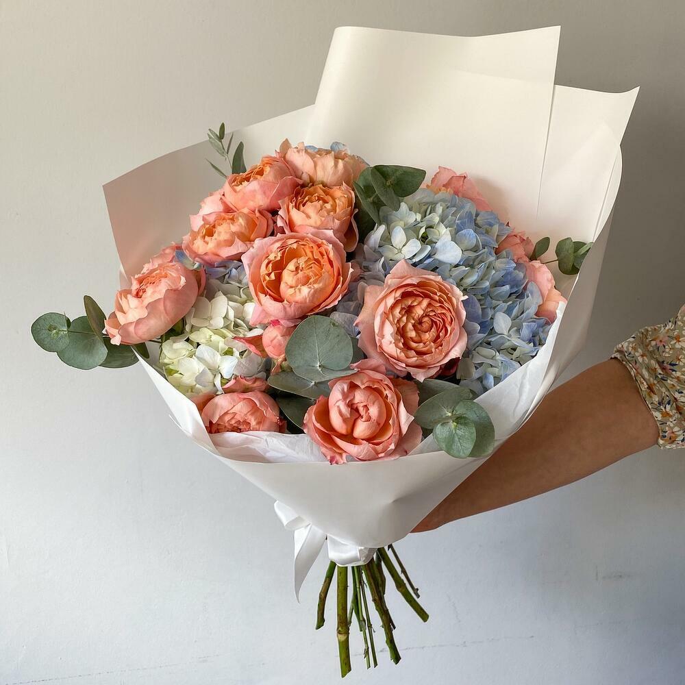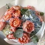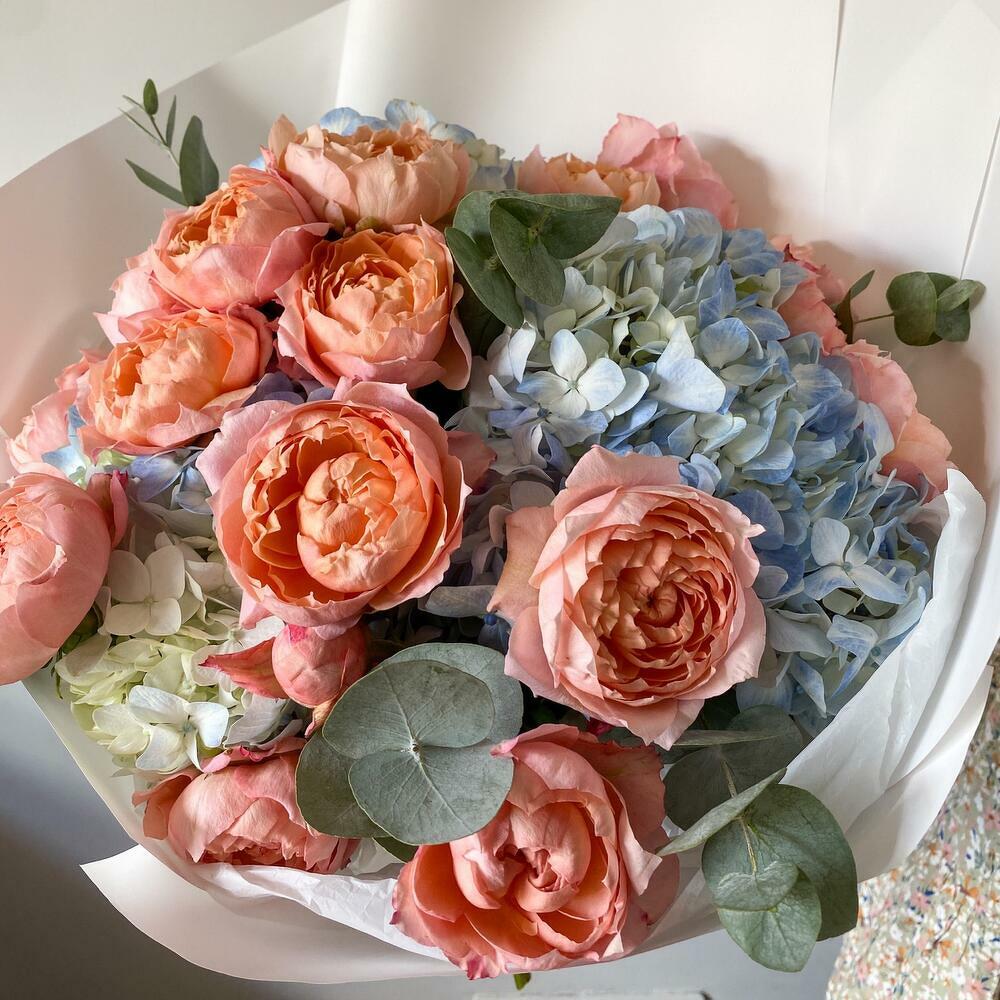 Delicate bouquet of Juliet peony roses and blue hydrangeas This is the perfect bouquet for making someone's day special. Here’s a flower care tip: at home, we recommend using plant food to make cut flowers last longer, along with the joy of the gift.