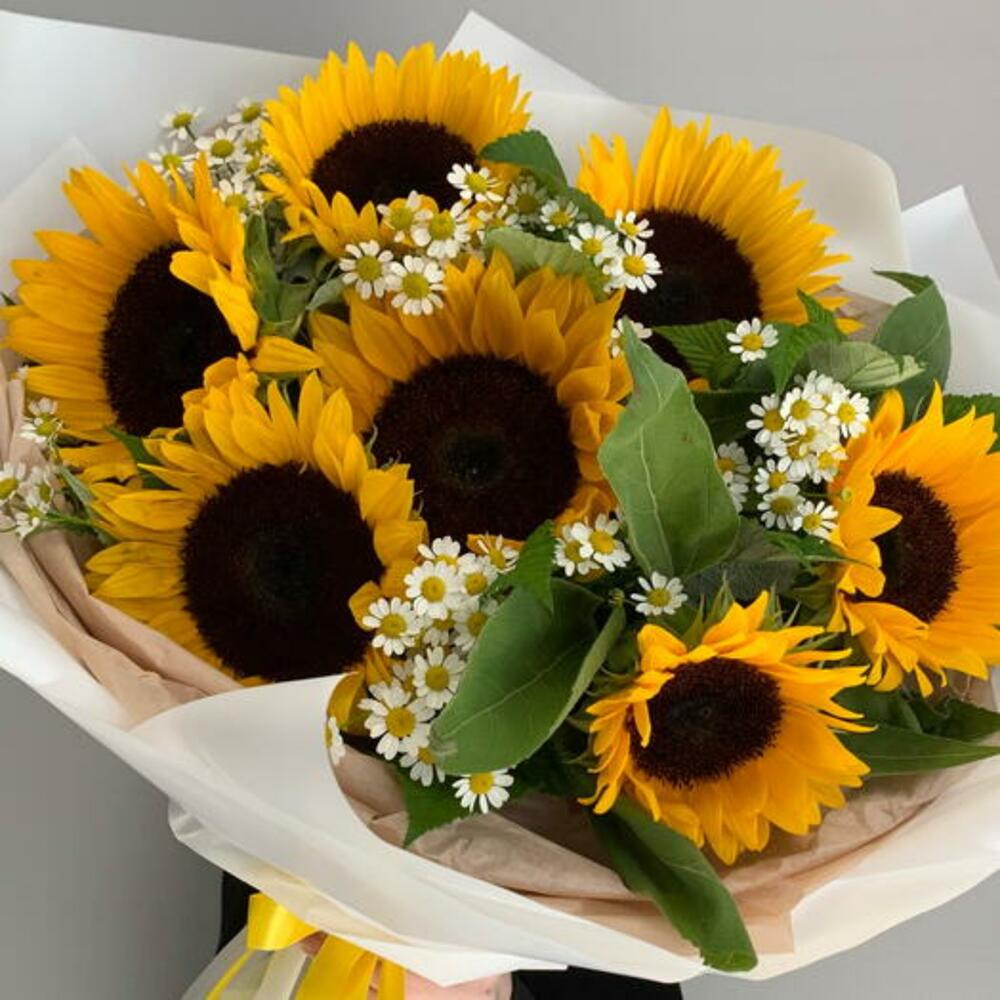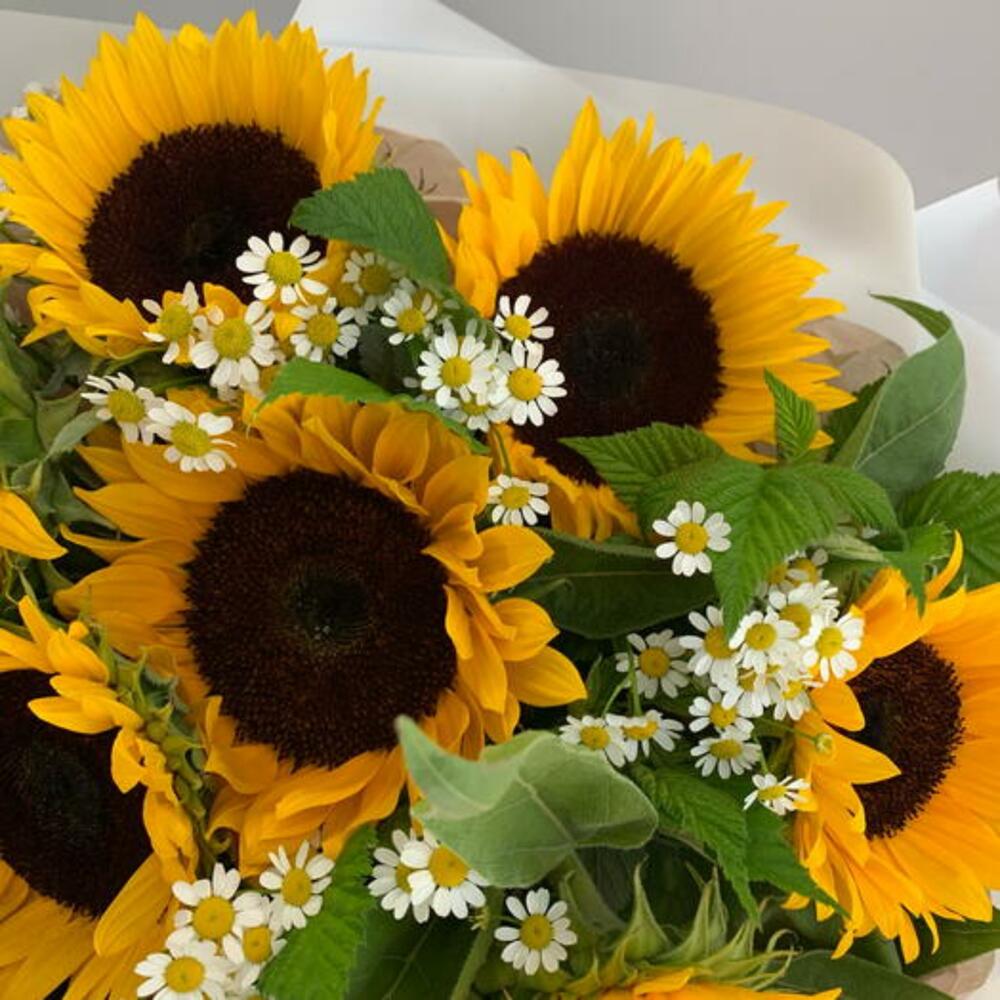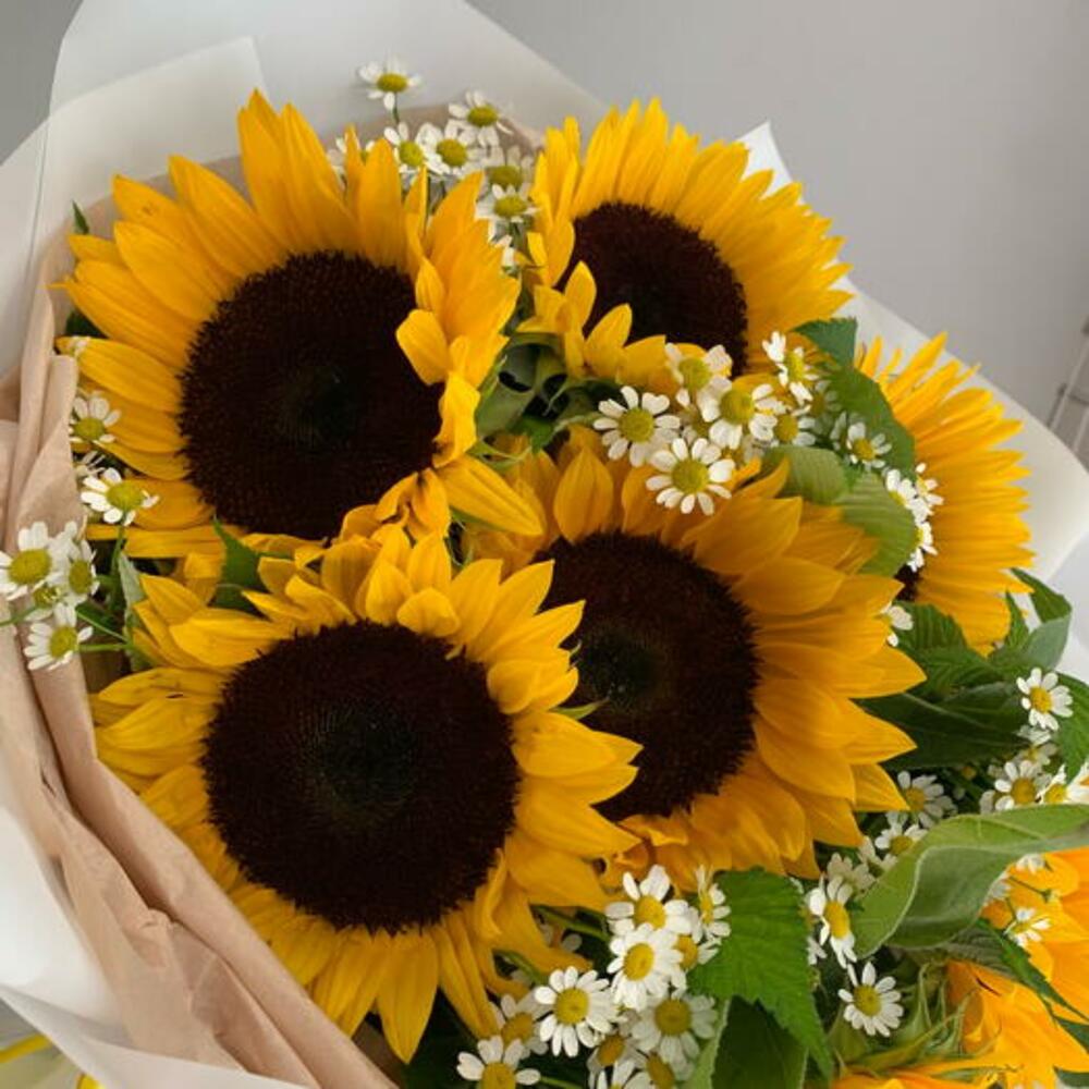 Sunflower - 7 pcs design packaging - 4 pcs raspberry greens - 5 pcs tanacetum chamomile - 5 pcs