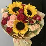 Brighten someone's day with our Berry Summer bouquet, featuring a vibrant mix of sunflowers, red roses, and pink roses. The cheerful sunflowers symbolize adoration and loyalty, while the elegant red and pink roses add a touch of love and grace. Expertly arranged and beautifully wrapped, this bouquet is perfect for any occasion. Gift the bouquet to someone special or enjoy its joyful charm yourself. Let the bright sunflowers and elegant roses bring happiness and warmth to any moment.