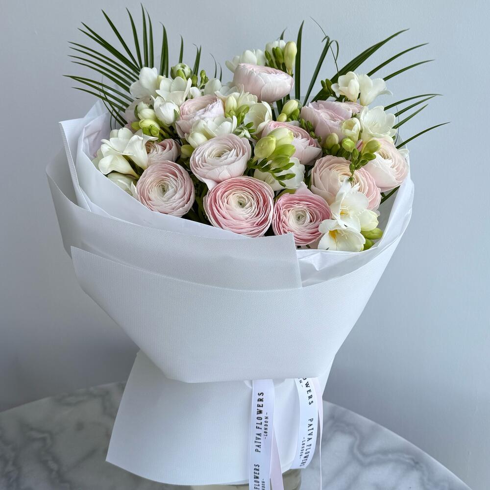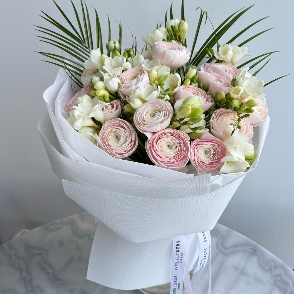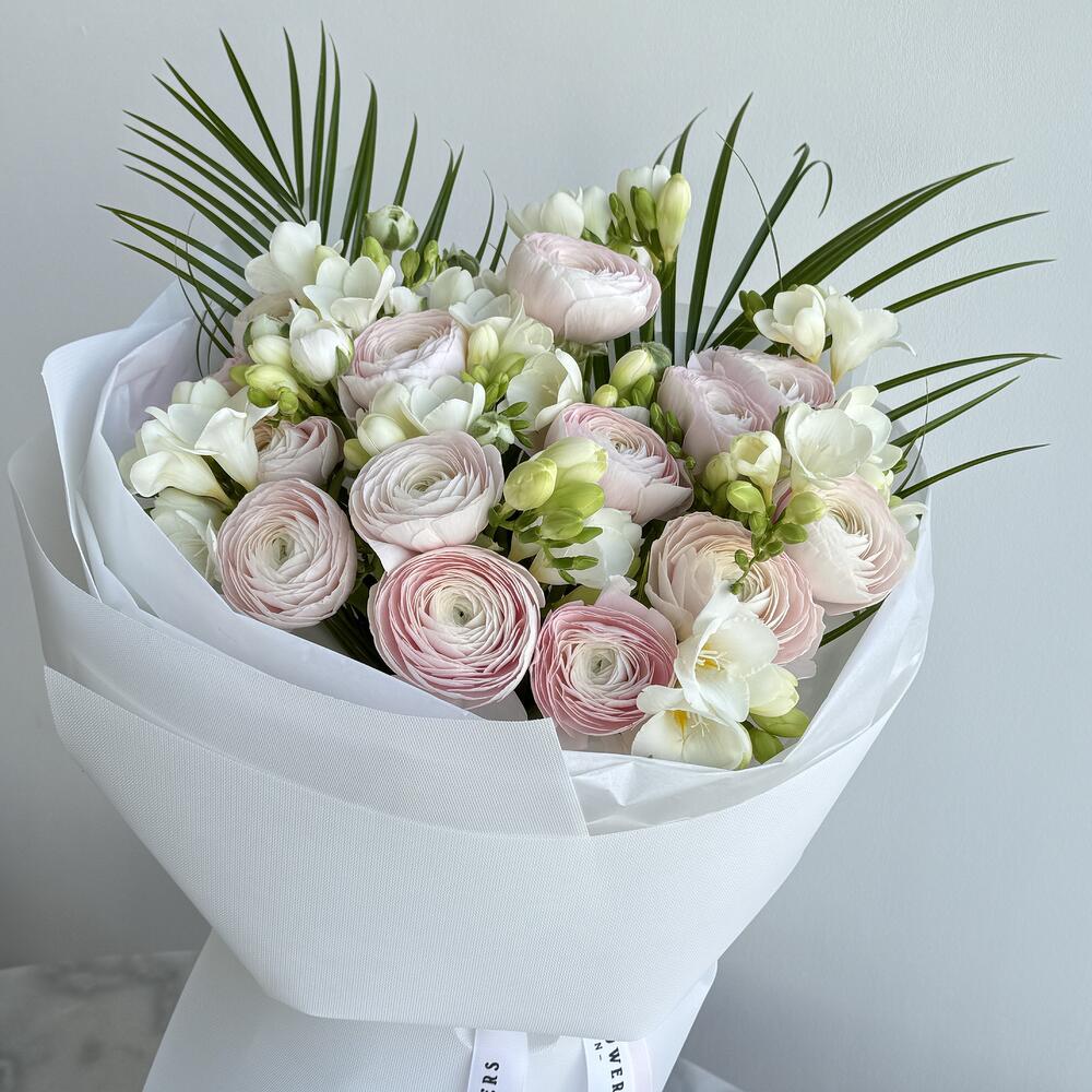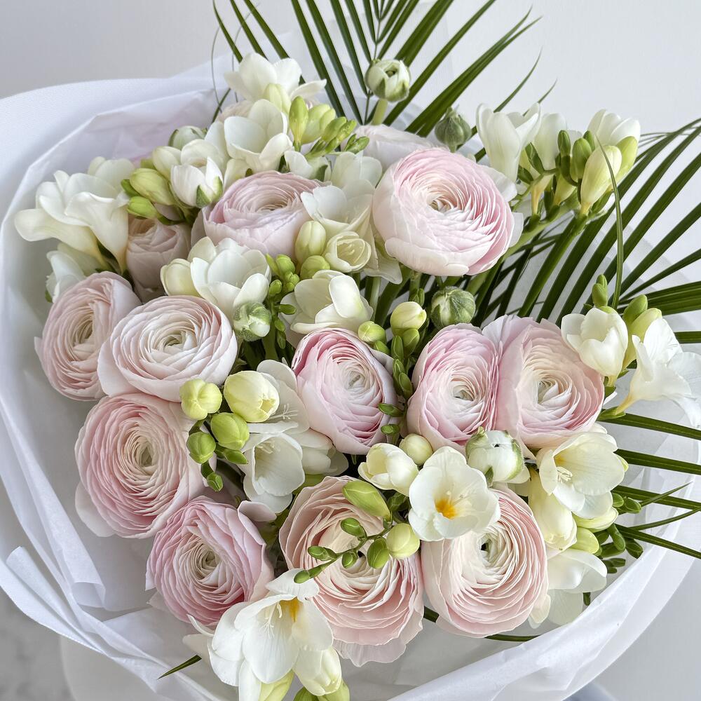 Freesia - 19 pcs palm leaves - 2 pcs ranunculus hanoi pink - 16 pcs