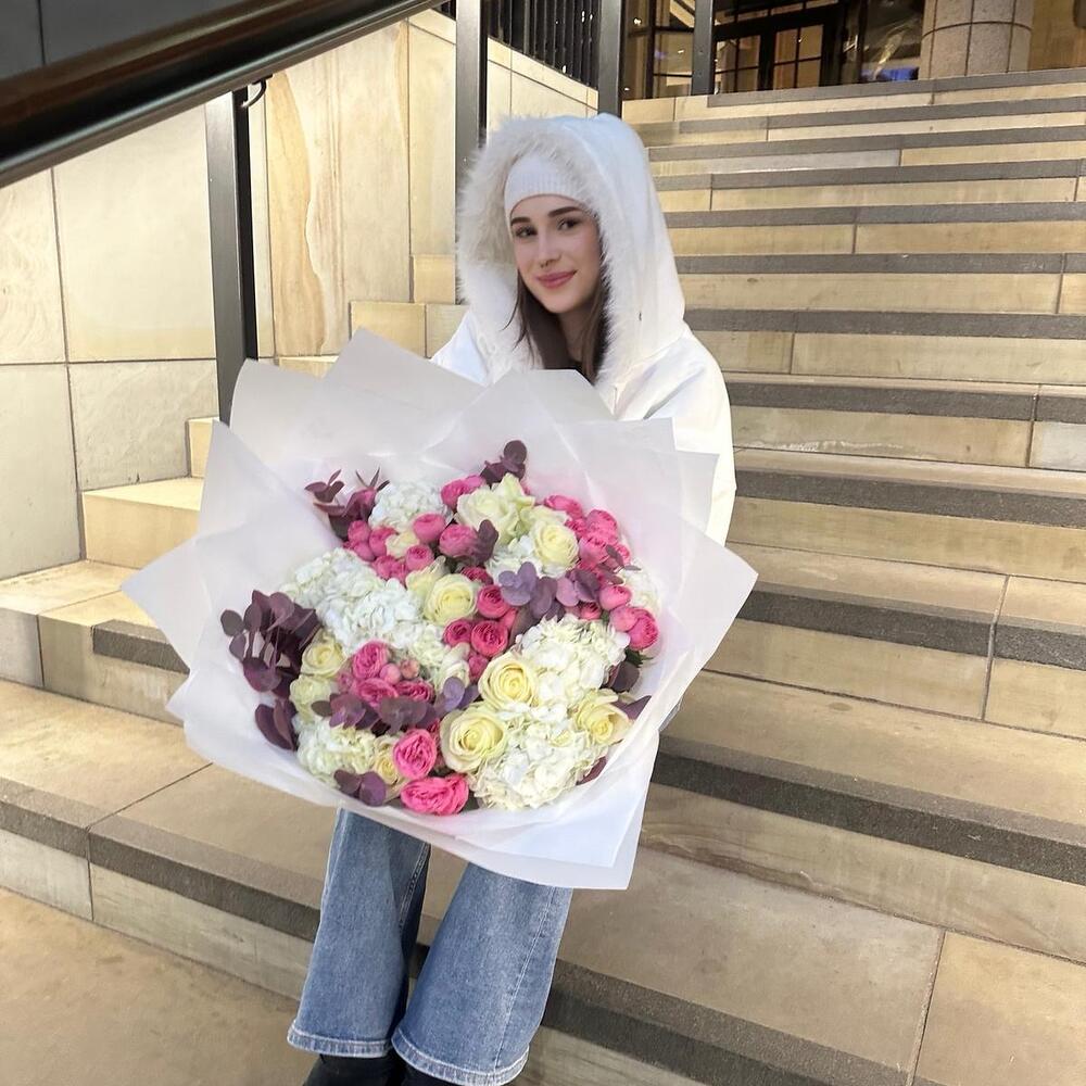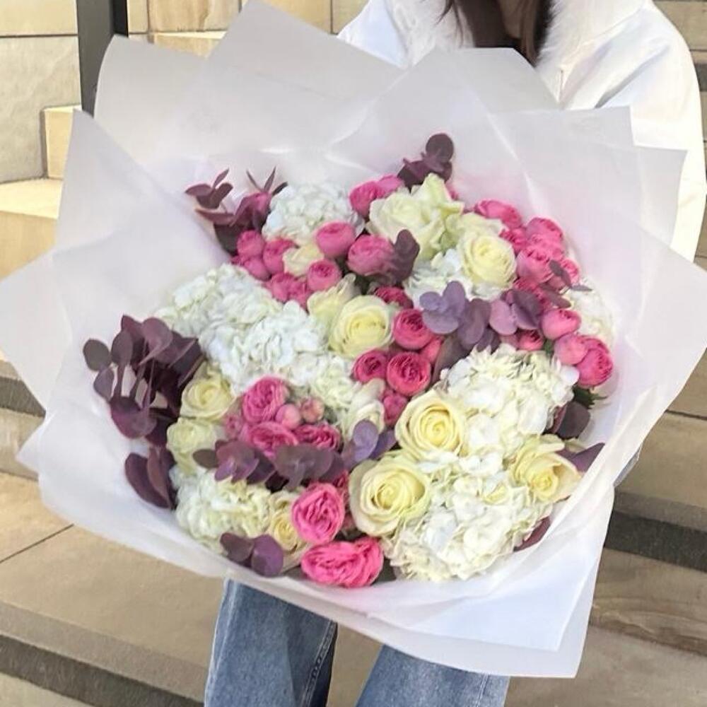 Eucalyptus - 5 pcs Spray rose - 5 pcs hydrangeas white - 5 pcs roses - 10 pcs