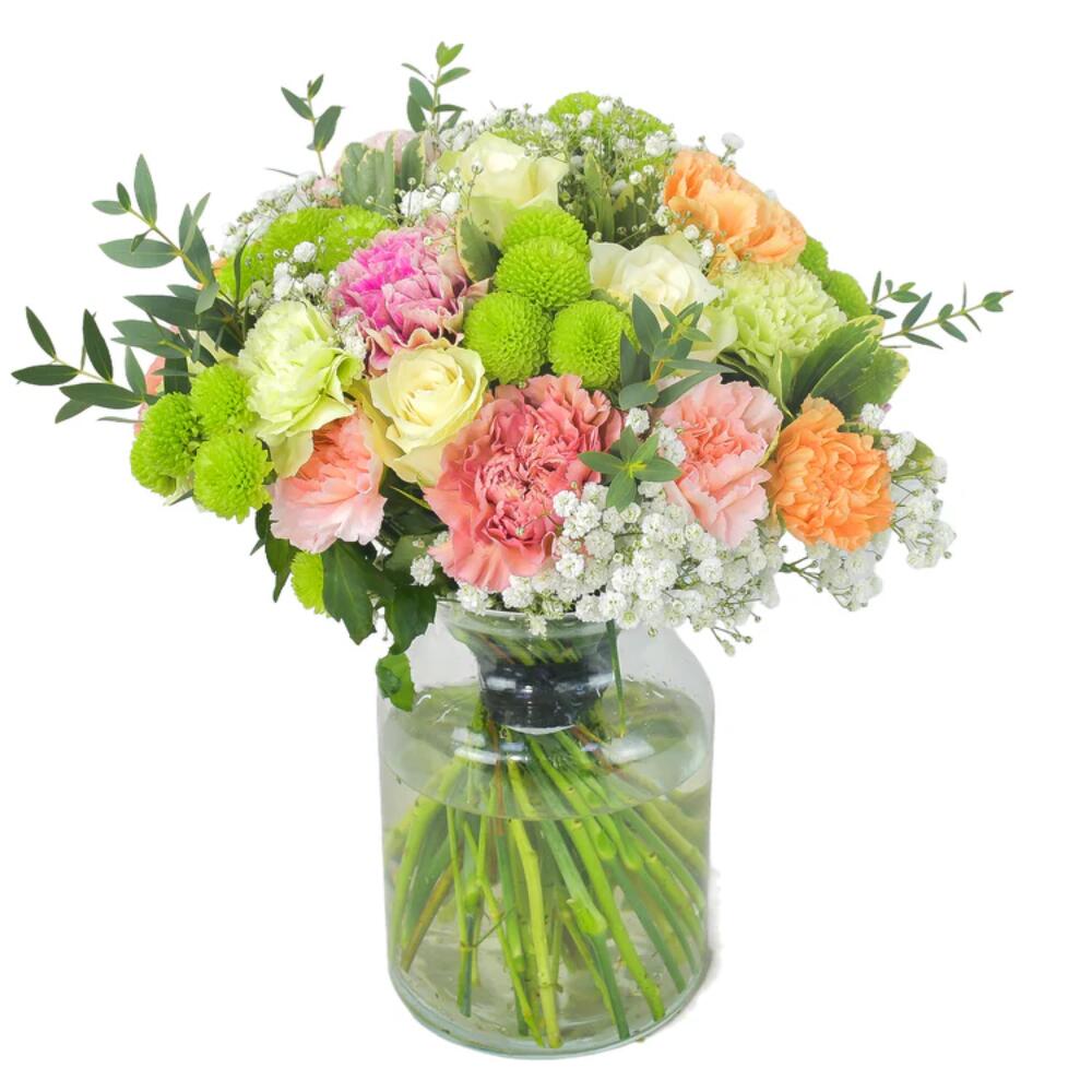 A funky arrangement with plenty of pizazz. Featuring carnations, green santini, roses, gypsophila seasonal foliage.