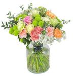 A funky arrangement with plenty of pizazz. Featuring carnations, green santini, roses, gypsophila seasonal foliage.