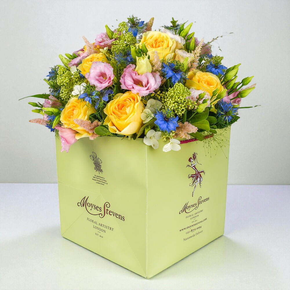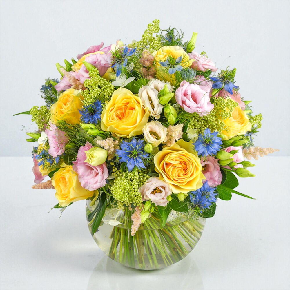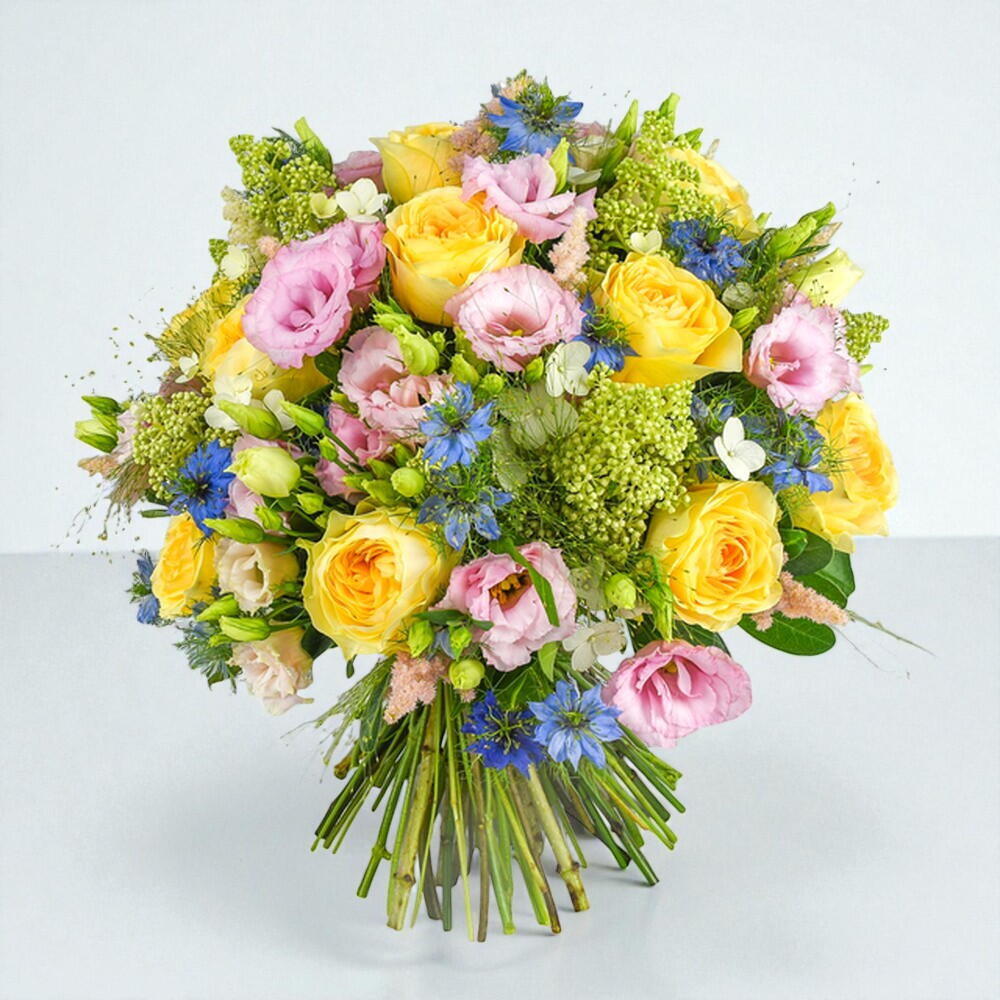 An exuberant bouquet of flowers that is assured to bring a touch of sunshine into your loved one’s life with our stunning Buttercup garden roses. The refreshing tones of the Buttercup roses are complimented with Lisianthus, sky blue Nigellas, stunning Astils and a range of other complimentary flower fillers. A perfect gift for just about any occasion.