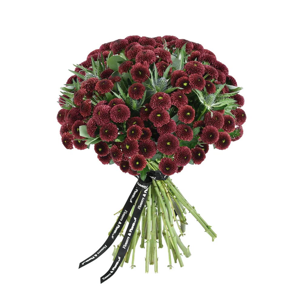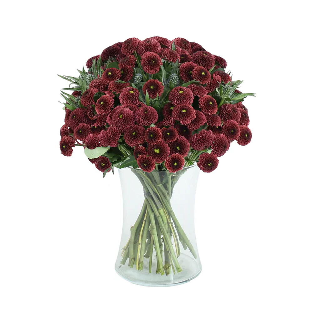 Dramatic, daring and utterly distinctive — this bouquet is for those who love flowers with a little edge. Rich clusters of deep red santini bring warmth and intensity, while spiky blue thistle adds an unexpected, wild beauty that sets this arrangement apart.