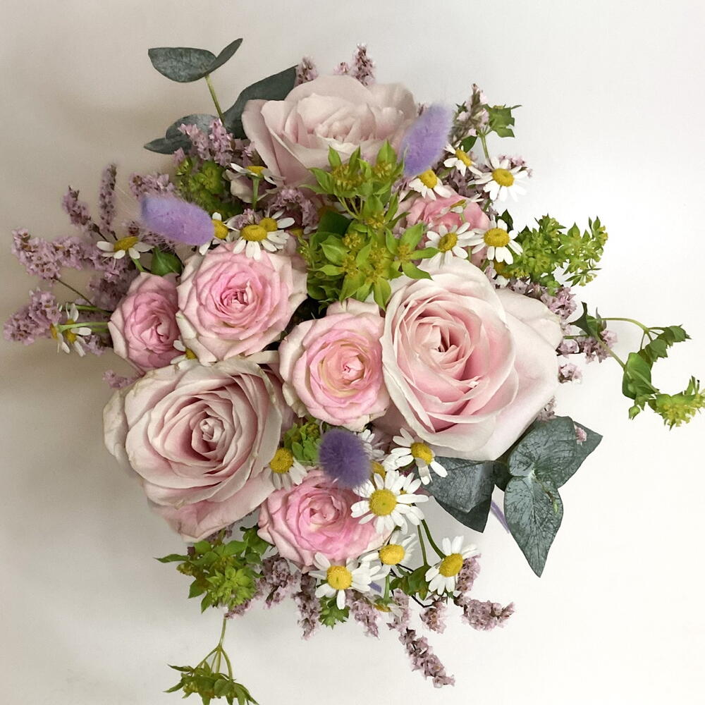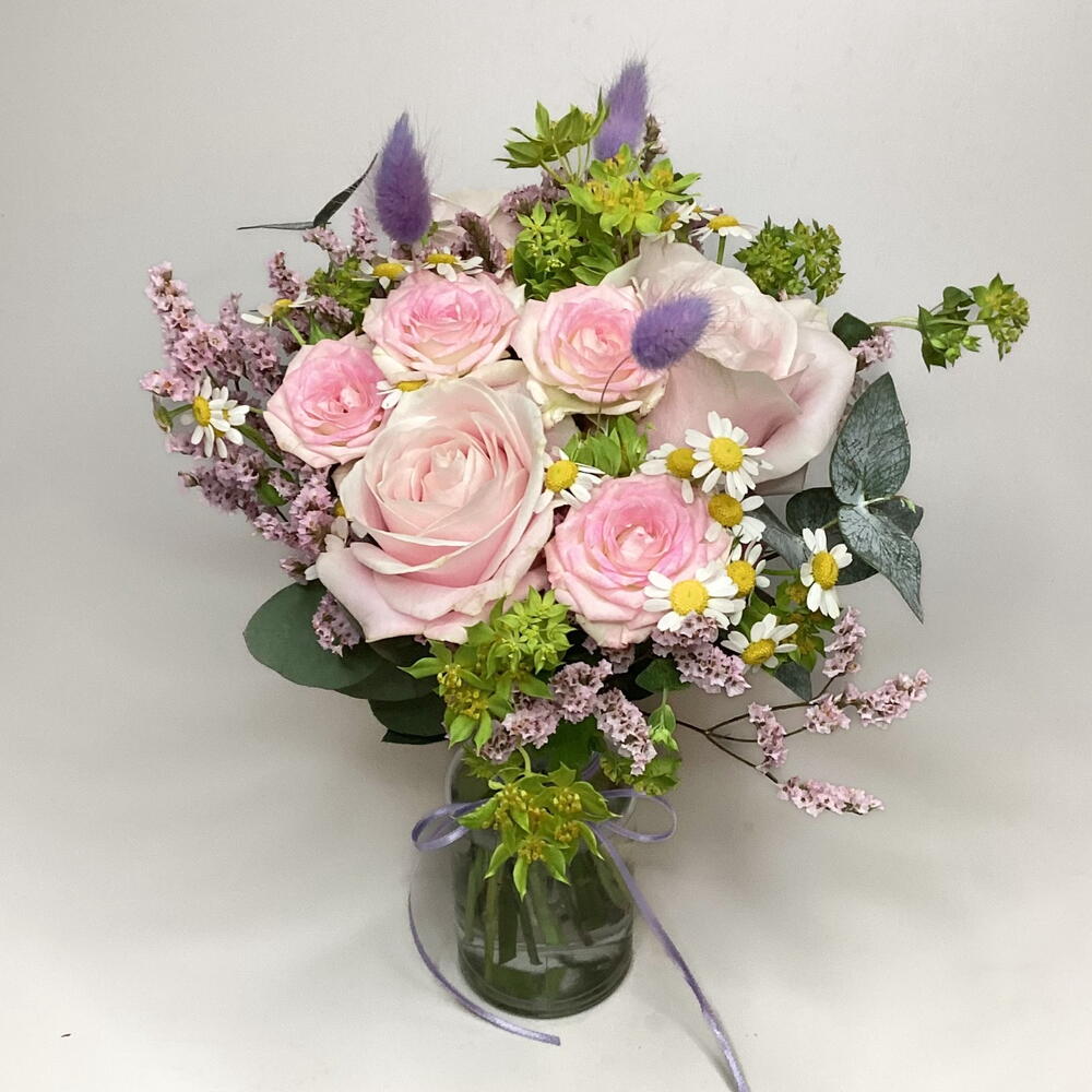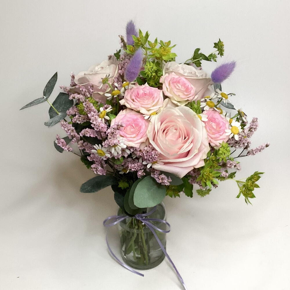 A cute little 10cm jar filled with pastel pink roses, spray rose, chamomile, bupleurum and dried bunny tails.