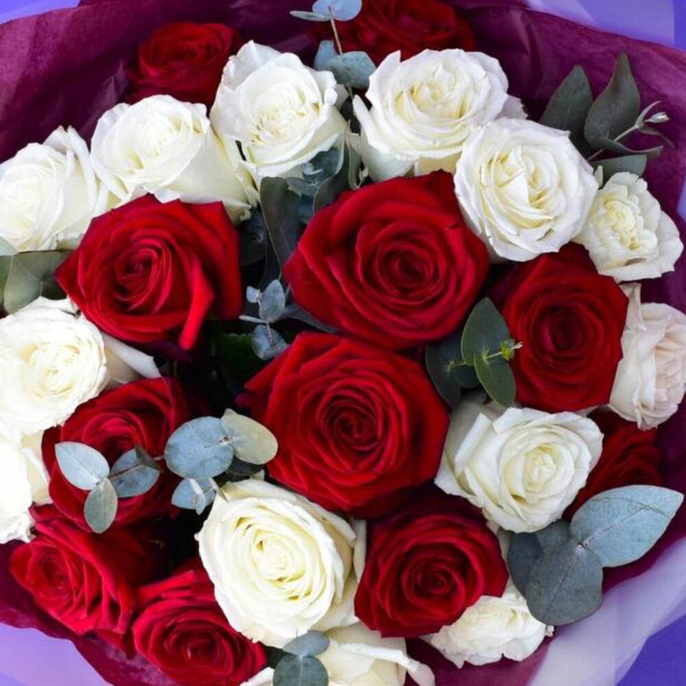 Ribbon - 1 pcs Eucalyptus - 10 pcs White rose - 13 pcs packaging - 1 pcs red naomi rose - 12 pcs